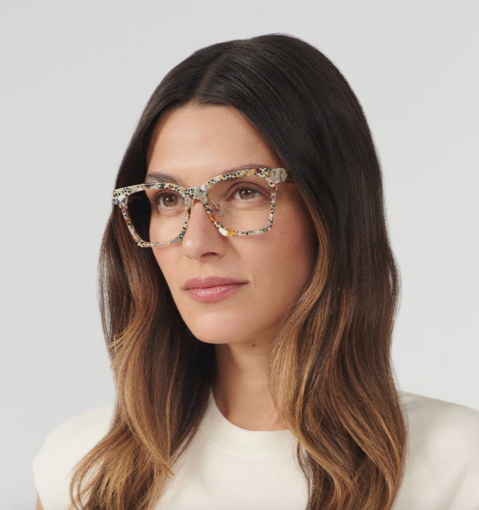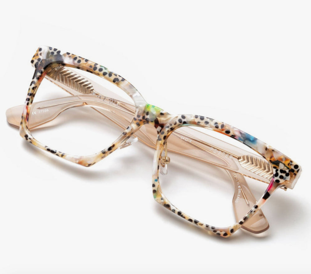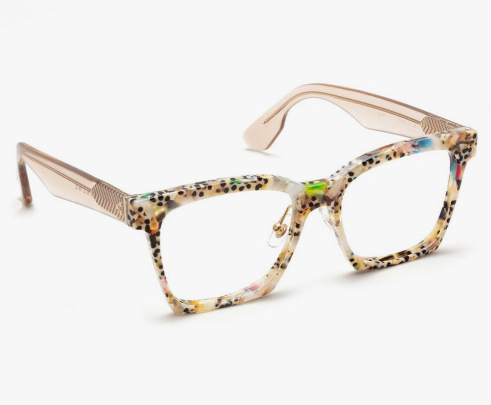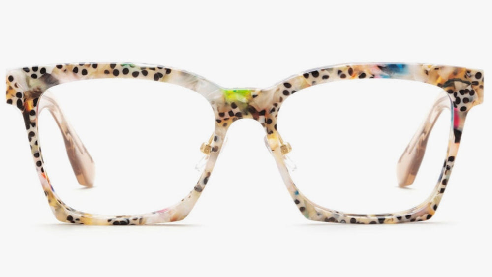 These stylish eyeglasses feature a bold square silhouette in a unique speckled tortoiseshell pattern with multicolored accents including hints of blue and pink. The frame has a contemporary geometric design with angular corners and a substantial presence. The pattern combines classic tortoiseshell with modern artistic flair, creating a sophisticated yet playful aesthetic suitable for everyday wear. The translucent acetate material allows some light to pass through, adding depth to the frames appearance.