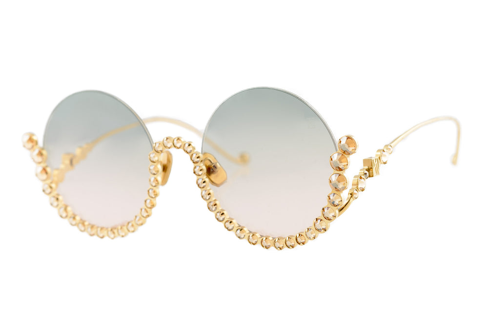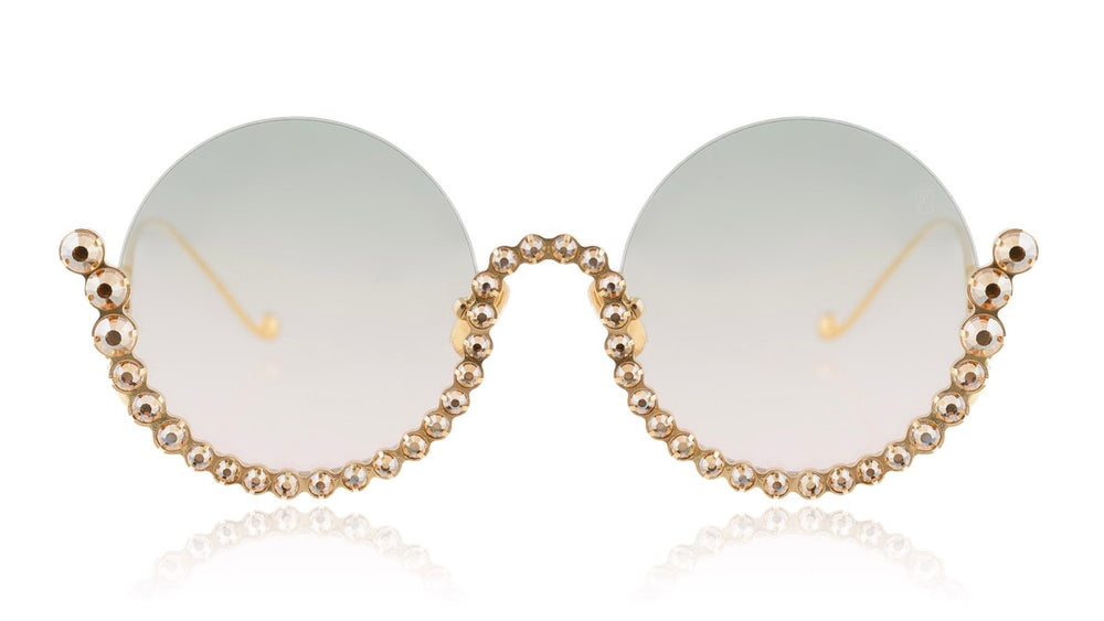 Luxurious oversized round sunglasses featuring a stunning gold-toned crystal-embellished bottom rim design. The frames have a delicate, semi-rimless construction with the crystals creating a glamorous half-moon effect along the bottom edge. The lenses are subtly gradient and oversized, while the temple arms maintain the elegant gold tone of the frame. The design offers a perfect blend of vintage glamour and modern luxury, with the crystal embellishments catching and reflecting light beautifully.