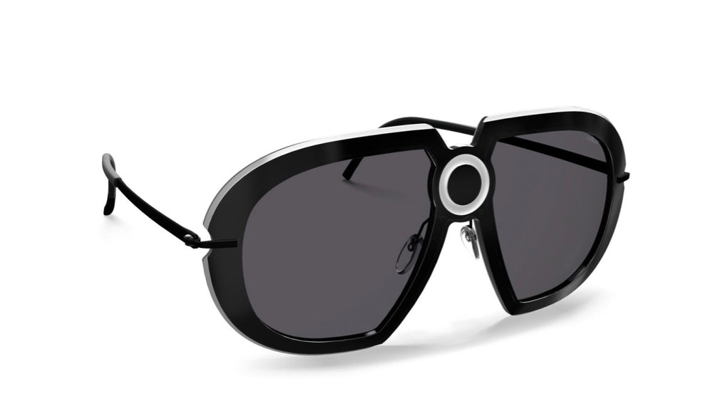 These distinctive geometric sunglasses feature a bold, avant-garde design with a prominent circular accent at the bridge. The frame has an angular, futuristic shape with sharp edges and a chunky build, staying true to its Futura name. The design incorporates a unique circular detail that serves as both a design element and bridge reinforcement. The lenses are dark grey, providing excellent sun protection while maintaining a sleek aesthetic. The overall design speaks to a bold, fashion-forward sensibility with its architectural lines and contemporary styling.