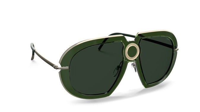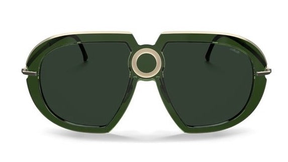 Bold retro-futuristic sunglasses featuring a distinctive geometric shape with sharp angles and a unique circular metal detail at the bridge. The frames have a solid green color scheme throughout with a substantial, architectural build. The design showcases an avant-garde aesthetic reminiscent of 1970s space-age fashion, with oversized lenses and dramatic angular cuts. The signature circular metal accent serves as both a design element and a functional bridge component, creating a striking focal point against the geometric frame structure.