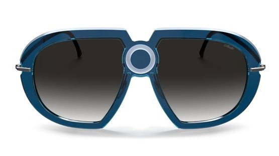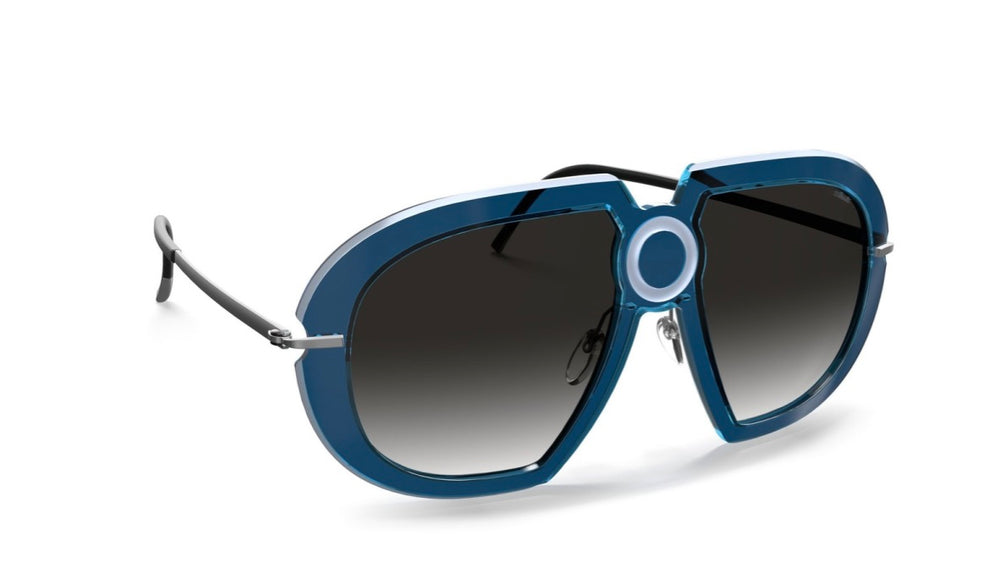 Distinctive retro-futuristic aviator-style sunglasses featuring a bold geometric shape with a unique circular accent at the bridge. The frames are finished in a metallic blue color with gradient grey lenses. The design incorporates clean lines and contemporary styling with vintage-inspired elements. Notable for its oversized geometric shape and pronounced angular cuts, creating a statement piece that balances bold design with wearable sophistication. The temple arms are sleek and minimalist, complementing the dramatic front frame design.