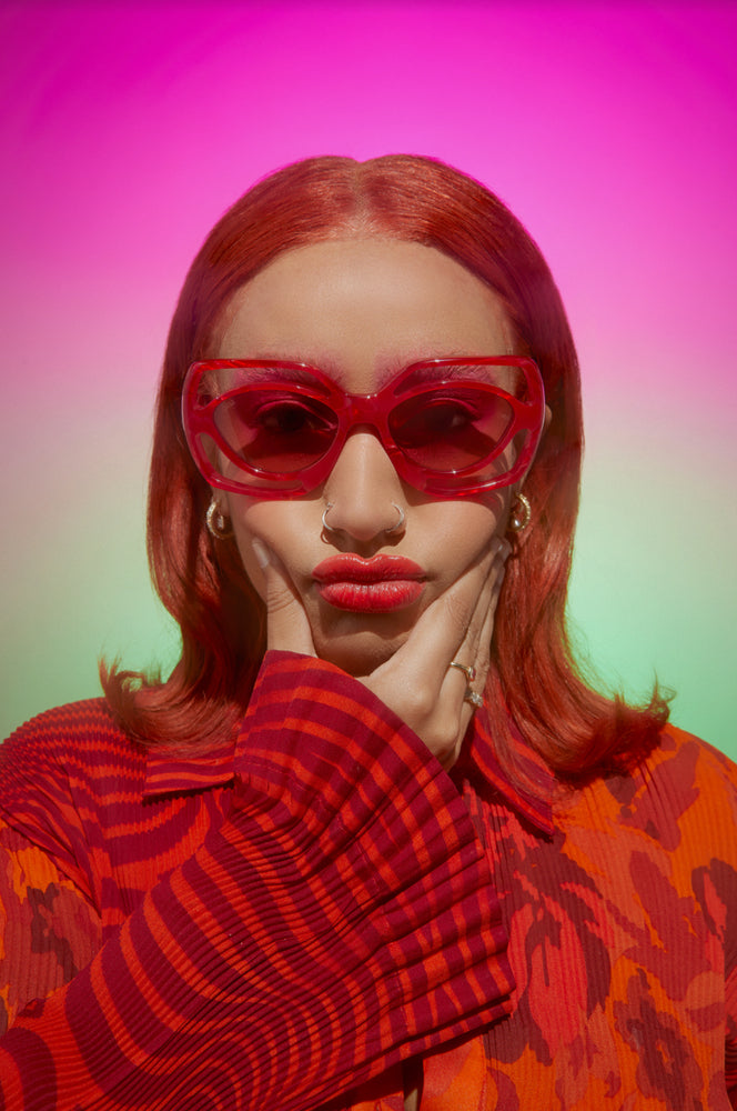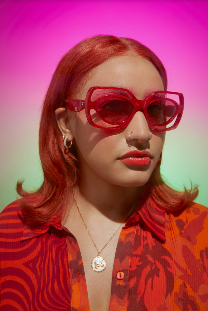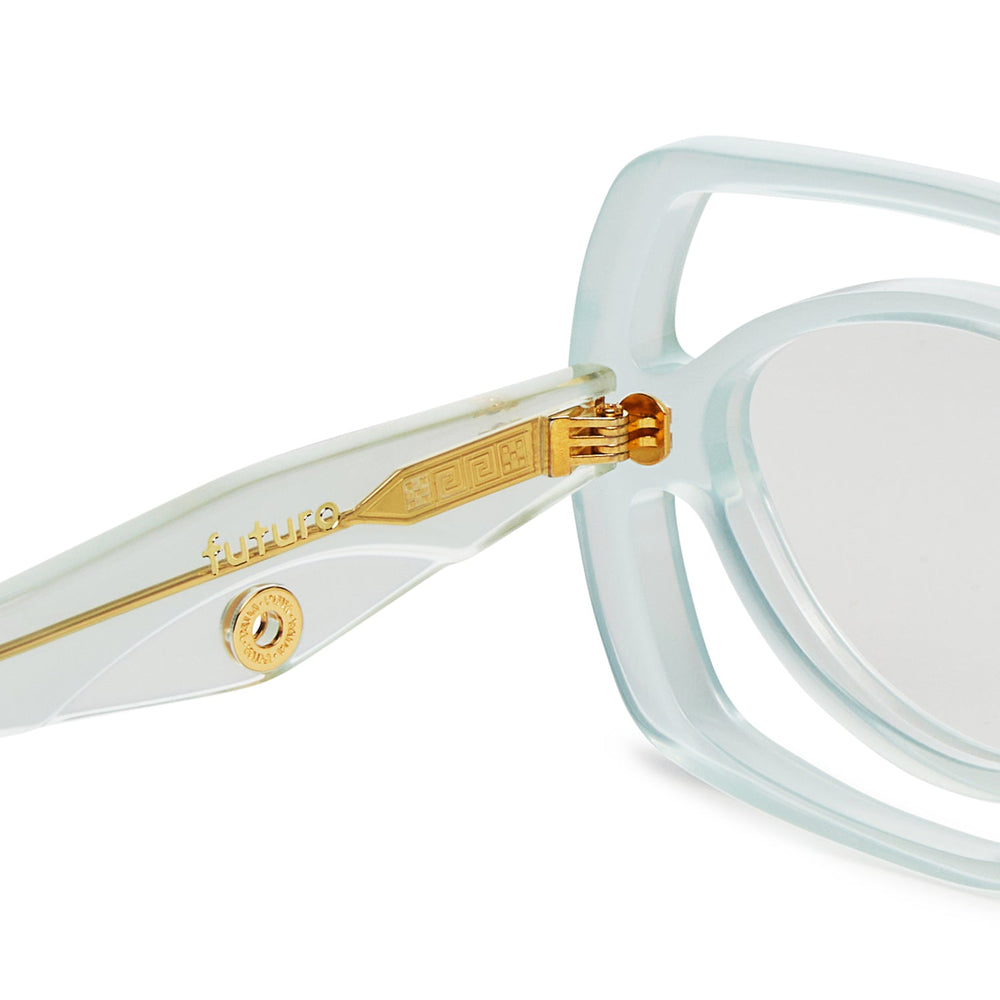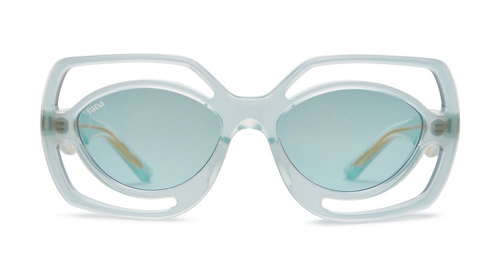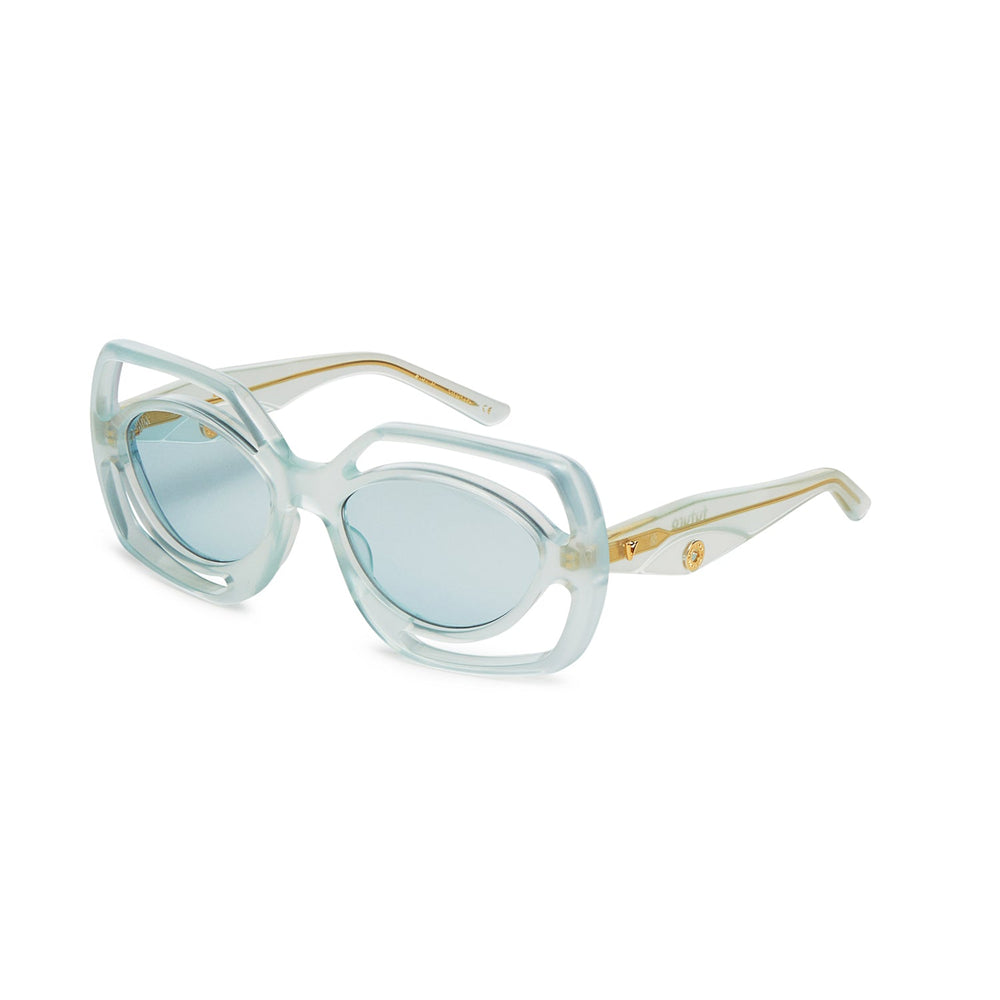These avant-garde oversized geometric sunglasses feature a distinctive futuristic design with cut-out details in the frame. The translucent light blue/white plastic construction gives them an ethereal, ice-like appearance. The frames have a bold architectural structure with angular geometric shapes and negative space elements that create a striking sculptural effect. The lenses are a subtle light blue tint that complements the frames cool colorway. The design demonstrates a strong fashion-forward aesthetic that would appeal to those seeking a statement piece with modern artistic flair.