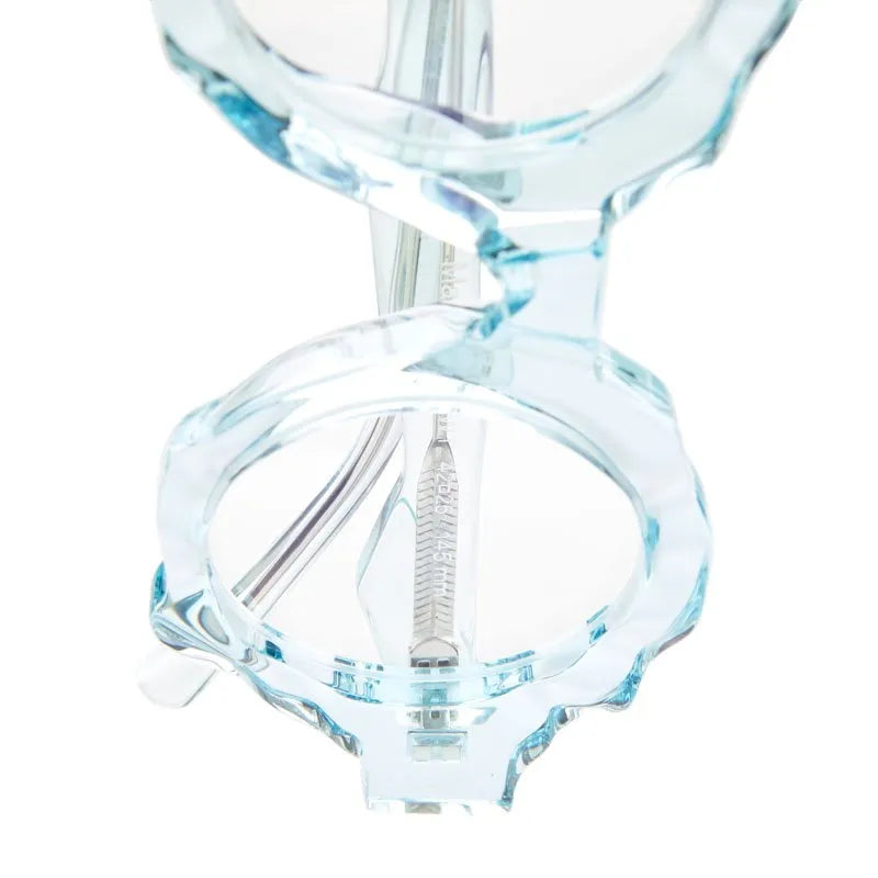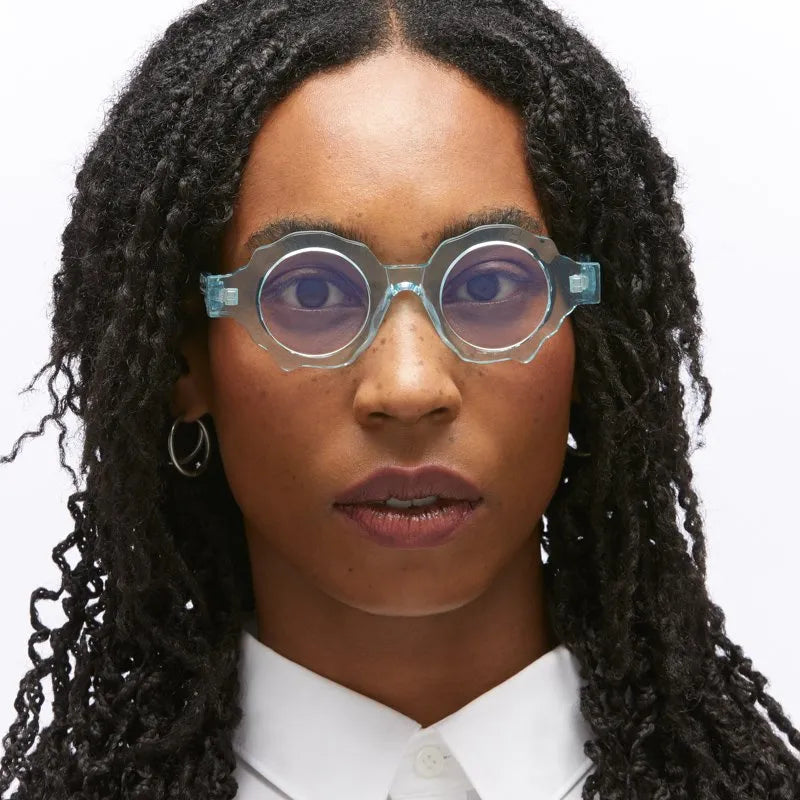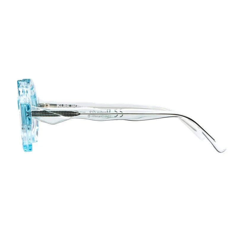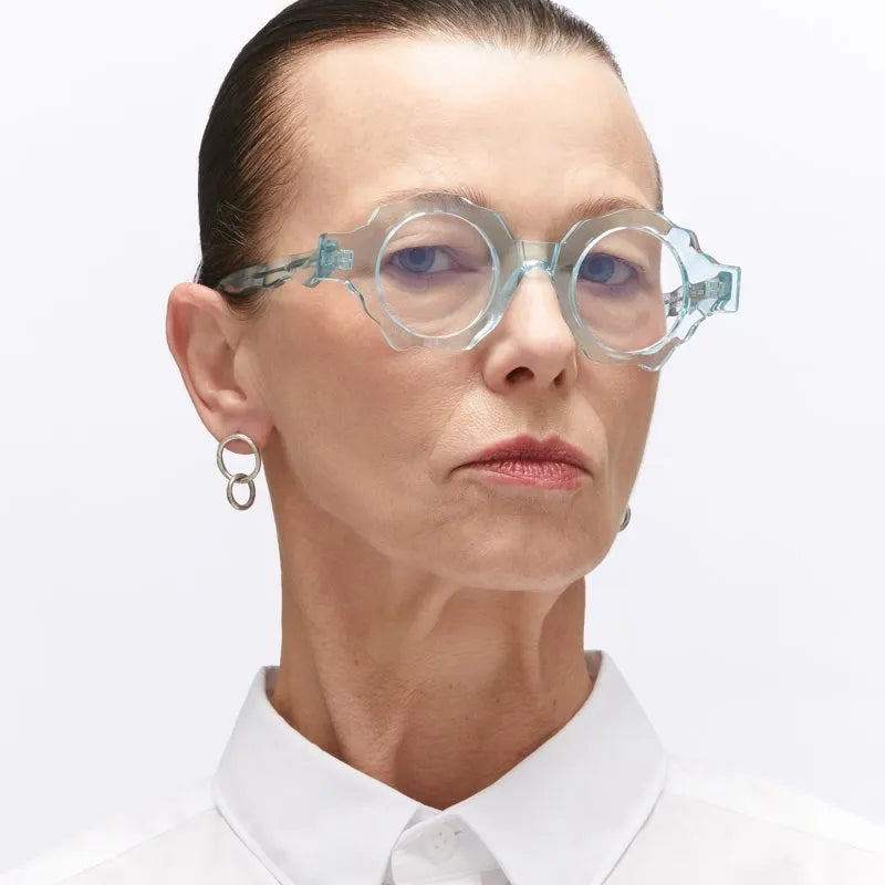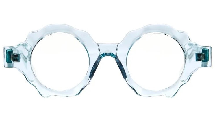 A striking pair of chunky transparent ice-blue acetate glasses with a bold geometric round shape. The frames feature an architectural, sculptural quality with faceted edges and an avant-garde aesthetic. The oversized round lenses are set in thick rims that create a dramatic, artistic statement. The transparent blue tint of the frames gives them an ethereal, crystal-like appearance that catches and plays with light.