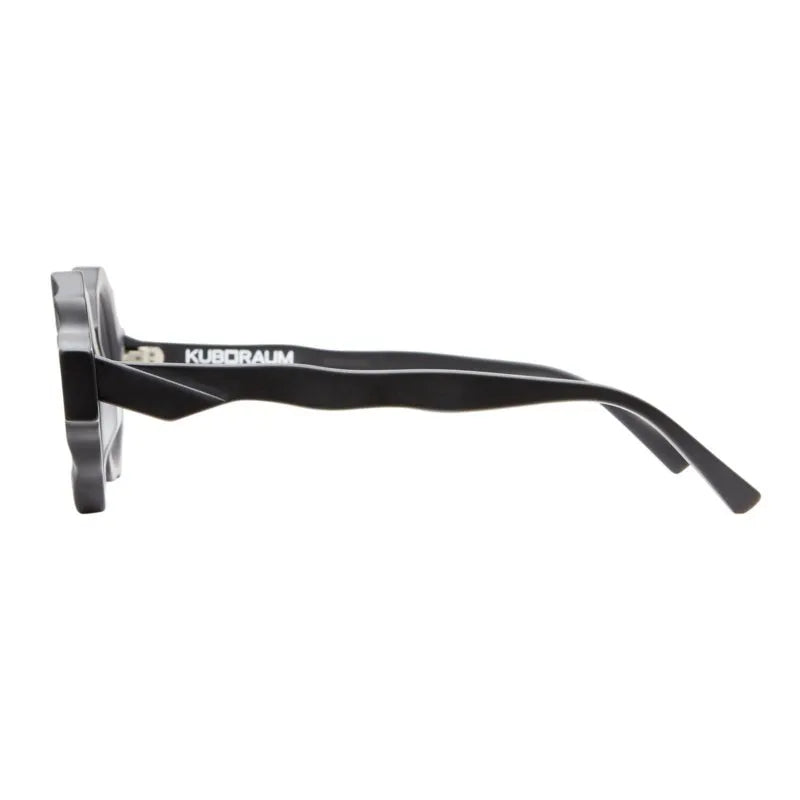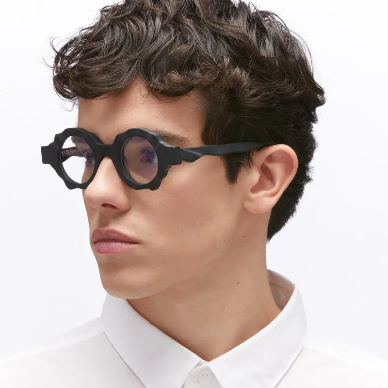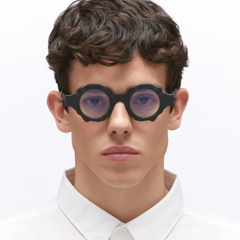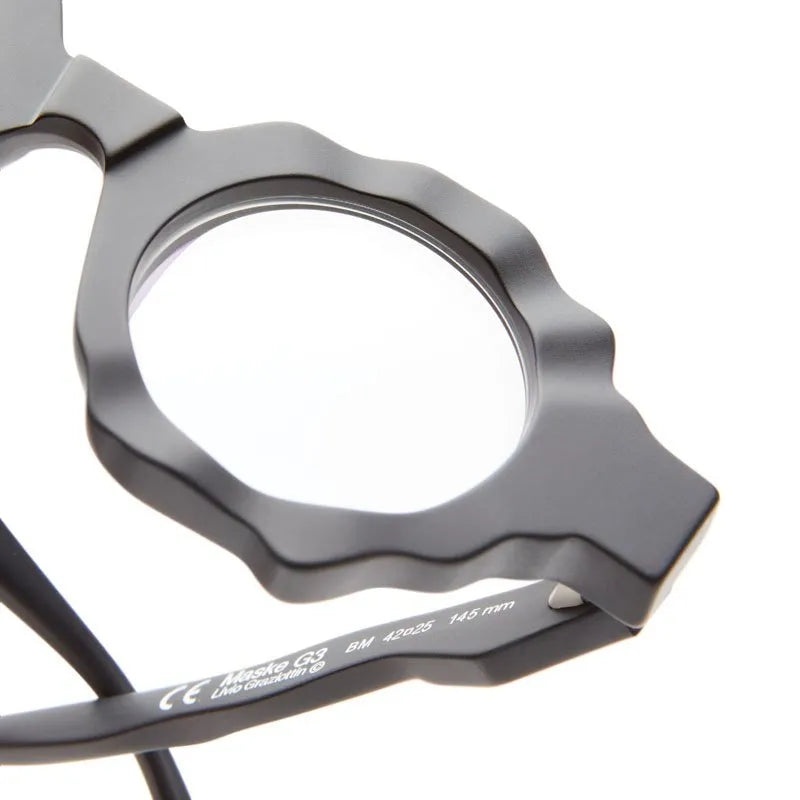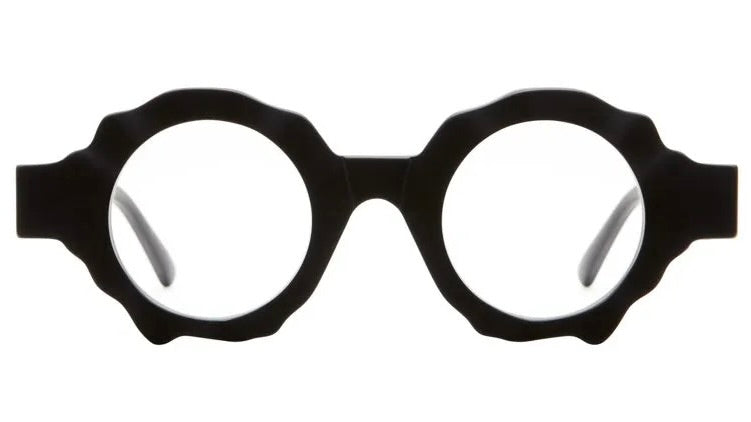 These are striking oversized round glasses with an avant-garde architectural design. The frames feature a distinctively thick, bold black plastic construction with a geometric, almost sculptural quality. The lenses are perfectly circular and clear, set within chunky rims that make a bold fashion statement. The design has an artistic, somewhat industrial aesthetic that would appeal to those seeking unique, statement eyewear. The temple arms are substantial and integrated seamlessly into the dramatic frame design.