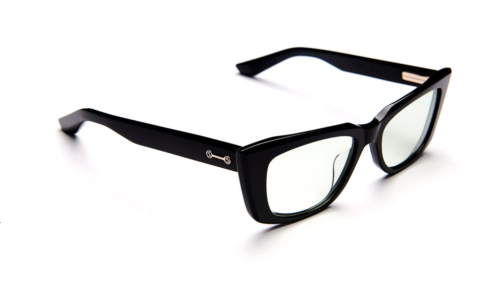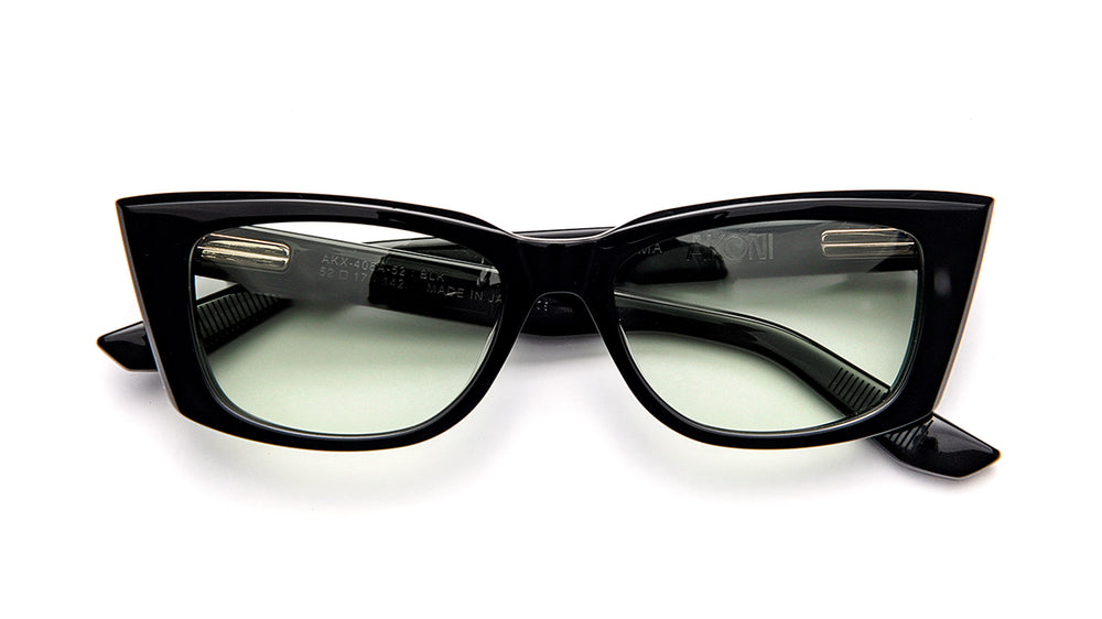 These are bold, retro-inspired cateye sunglasses with a dramatic upswept frame shape. The frames feature a glossy black finish with substantial thickness, giving them a luxurious, high-end appearance. The lenses have a subtle green gradient tint. The temple arms maintain the same substantial build quality as the front frame, with clean lines and minimal embellishment. The overall aesthetic is sophisticated and fashion-forward, with a timeless appeal that bridges vintage and contemporary design elements. The frames appear to be from the AKONI GAMMA collection, demonstrating excellent build quality and attention to detail in their construction.