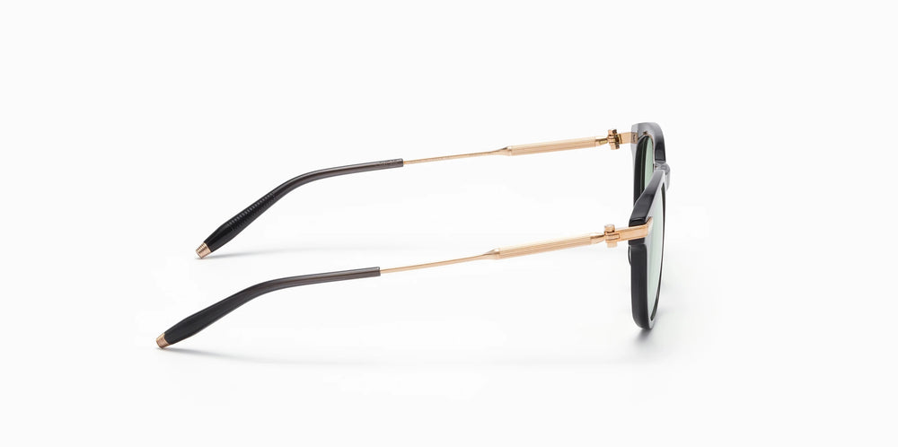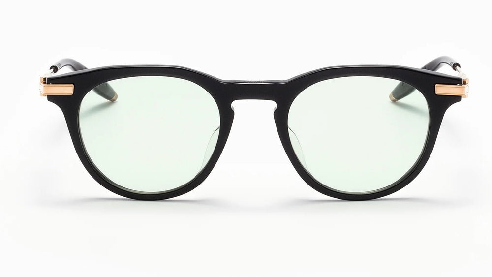 These sophisticated round-framed glasses feature a classic black plastic frame with elegant gold accents on the temple hinges. The design combines modern styling with retro influences, featuring a sleek saddle bridge and thin temple arms. The light green-tinted lenses add a subtle styling element while maintaining excellent clarity. The frames balanced proportions and clean lines make it a versatile choice for any face shape.