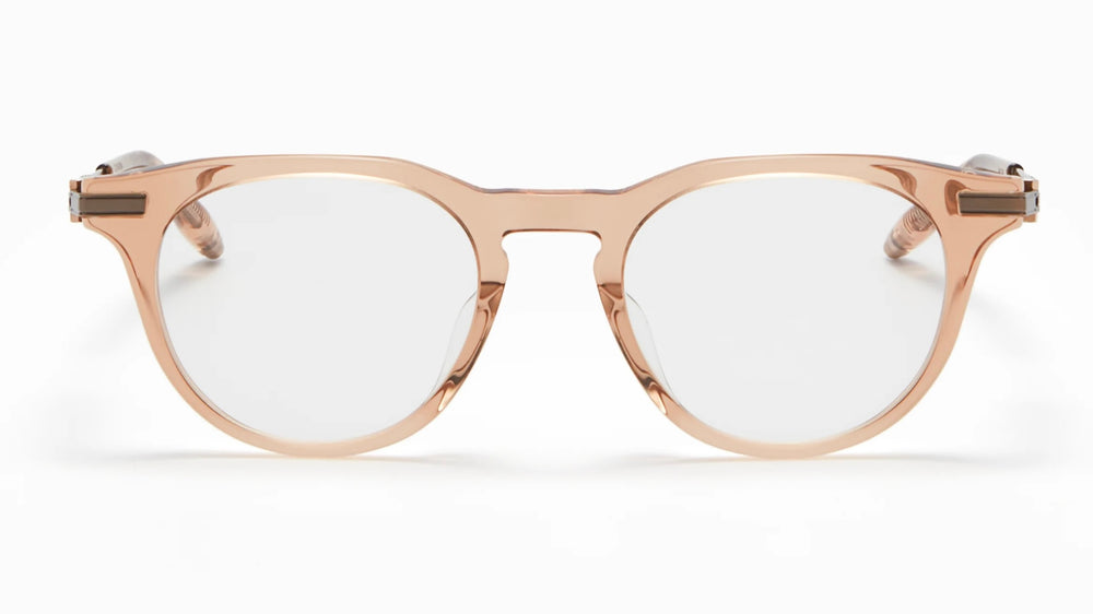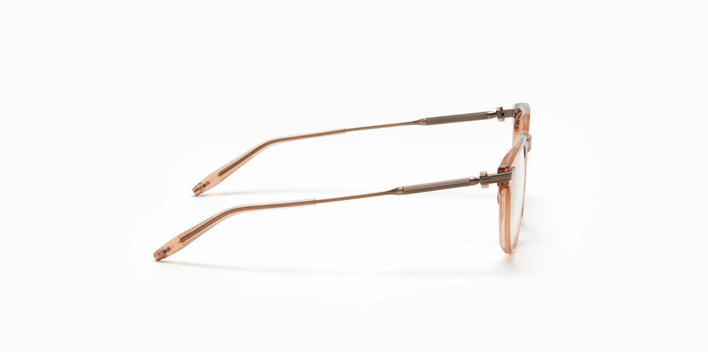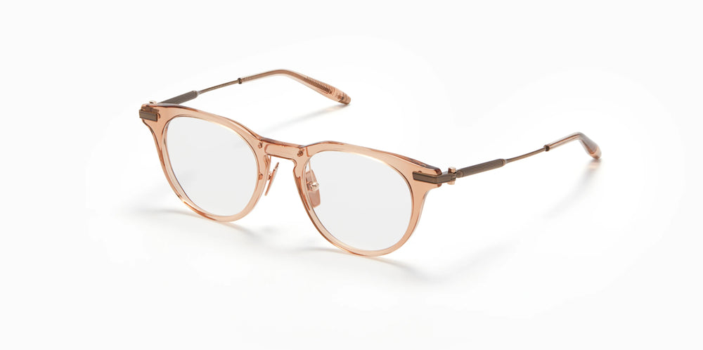 These elegant eyeglasses feature a translucent blush pink acetate frame in a contemporary round silhouette. The design is enhanced with sleek bronze-toned metal temple arms and subtle metal accents at the hinges. The frame has a refined medium thickness and a classic saddle bridge, creating a sophisticated yet versatile look suitable for everyday wear. The clear lenses and understated color palette make these glasses both professional and fashionable.