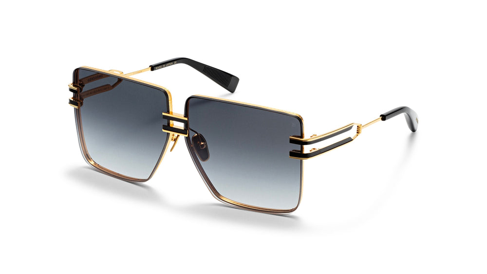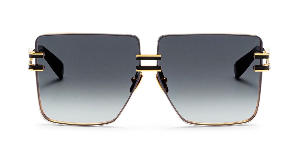 These luxury oversized square sunglasses feature a sophisticated rimless bottom design with gold metal framework. The distinctive hinges showcase architectural detailing with black accents, creating a bold contemporary look. The gradient grey lenses complement the sleek gold frame, while the minimalist bridge adds to the modern aesthetic. The temple arms integrate seamlessly with the frames design, making these sunglasses a perfect blend of high fashion and understated elegance.