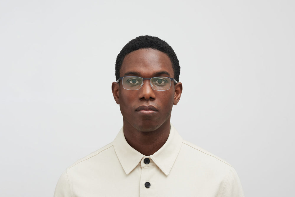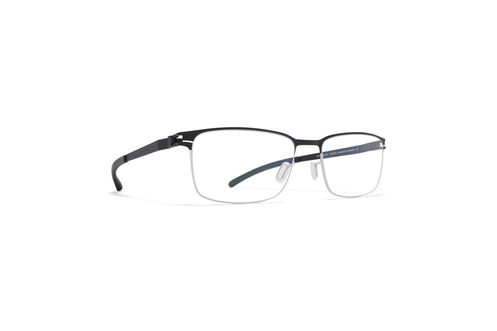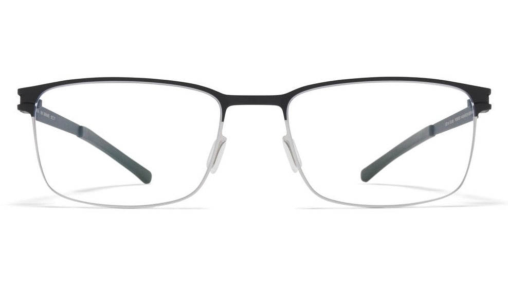 These sleek semi-rimless eyeglasses feature a minimalist design with a matte black upper frame and grey temple arms. The sophisticated metal construction creates a lightweight, professional appearance. The rectangular lenses are held by a thin top bar, while the bottom remains rimless for a modern, understated look. The nose pads are adjustable for comfort, and the temple arms feature a subtle taper towards the tips.