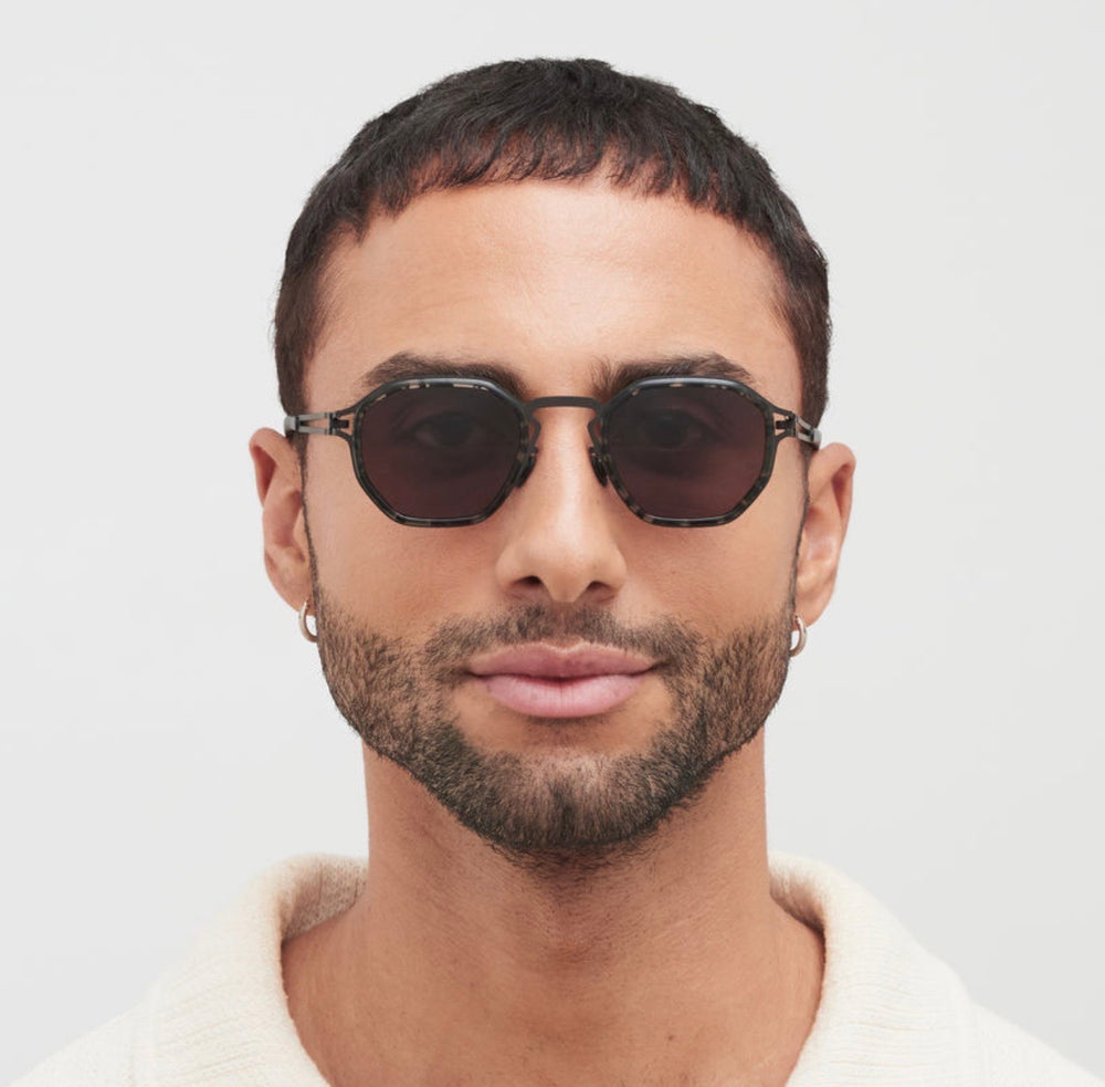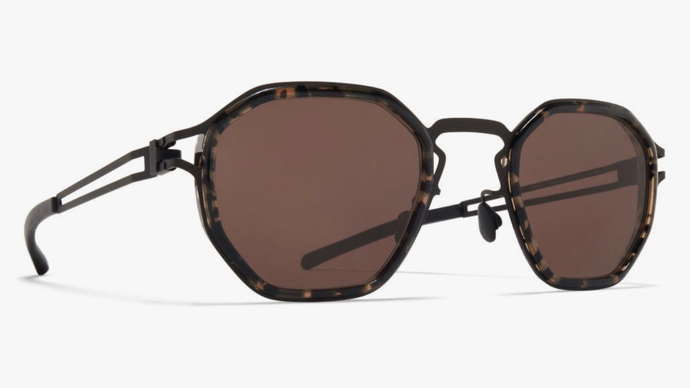 A sophisticated pair of geometric sunglasses featuring a unique tortoiseshell-patterned metal frame with angular edges. The design showcases a contemporary architectural aesthetic with clean lines and a minimalist bridge structure. The brown-tinted lenses complement the frames tortoise coloring, while the sleek metal temple arms create a refined silhouette. The sunglasses strike a perfect balance between avant-garde design and wearable elegance.