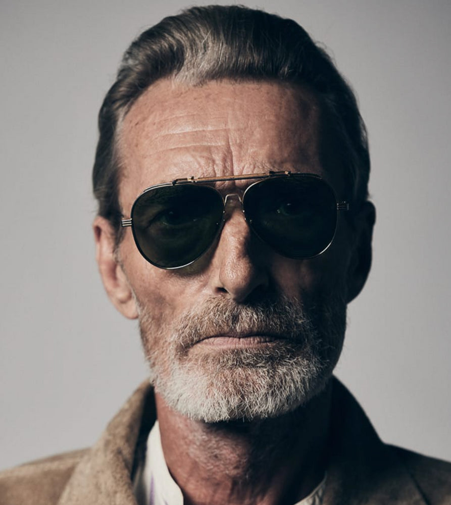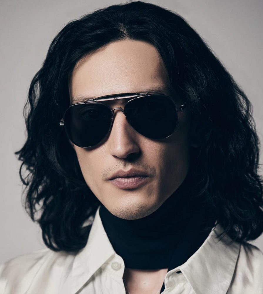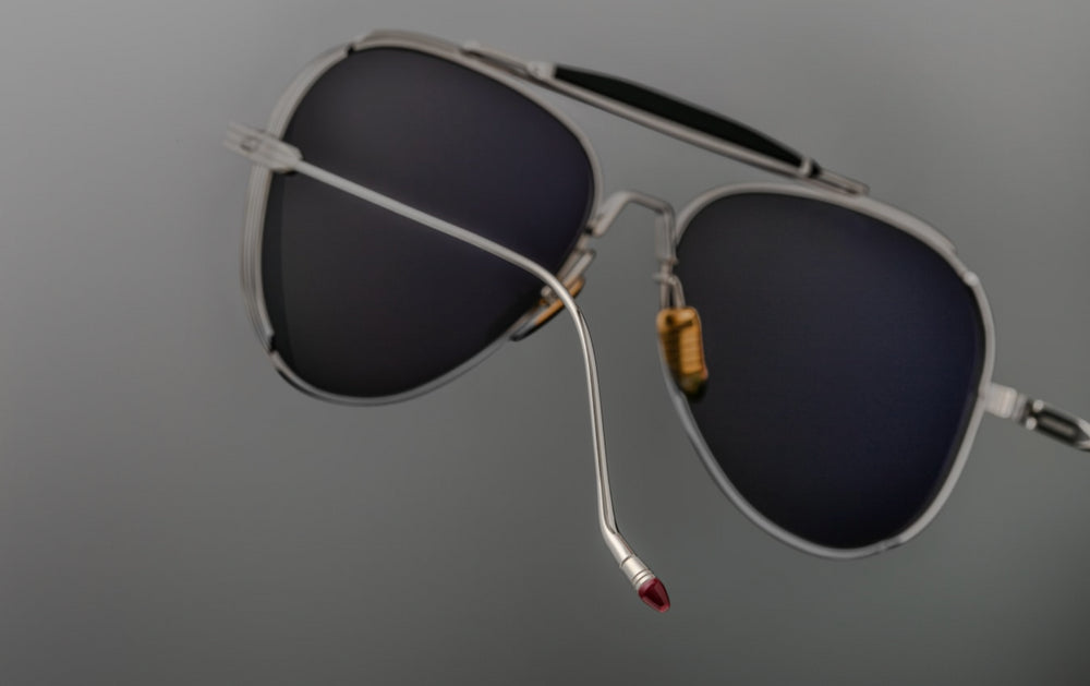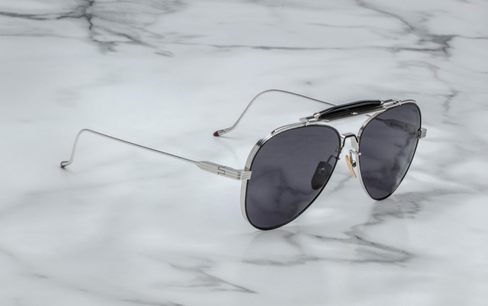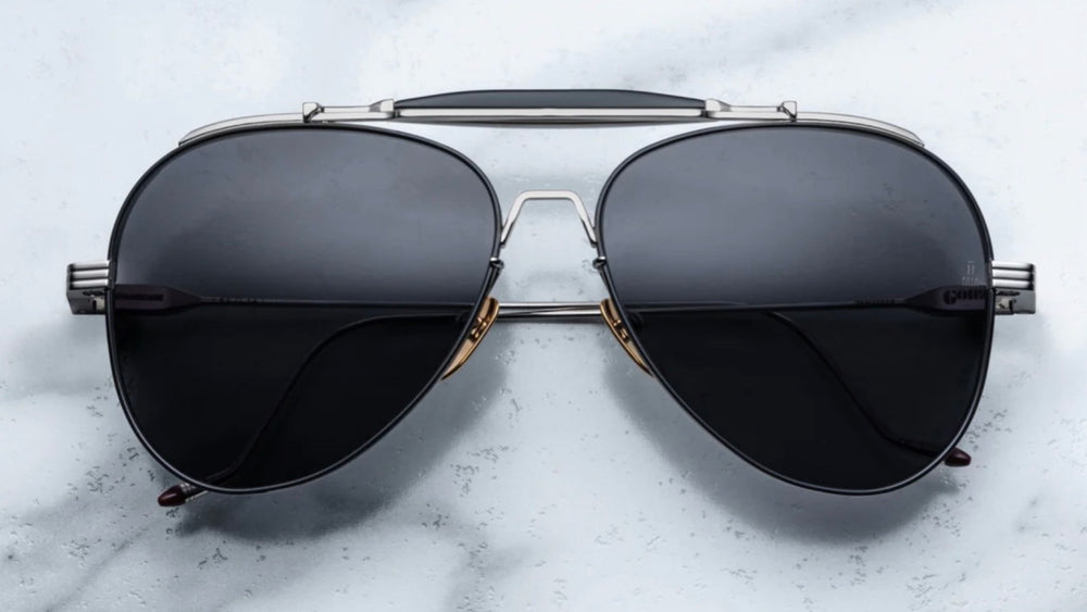 Classic aviator-style sunglasses with a sophisticated double-bridge design. The frame features a sleek silver metallic finish with contemporary styling. The dark black lenses create a striking contrast against the metallic frame. The design incorporates premium details like adjustable nose pads and a subtle top bar that adds structural elegance. The temple arms are slim and streamlined, maintaining the classic aviator proportions while offering a modern interpretation. These sunglasses exhibit exceptional craftsmanship with clean lines and balanced proportions typical of high-end eyewear.