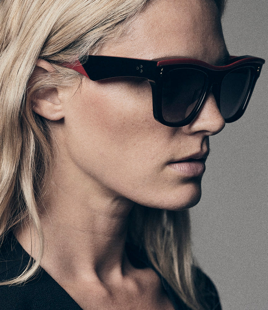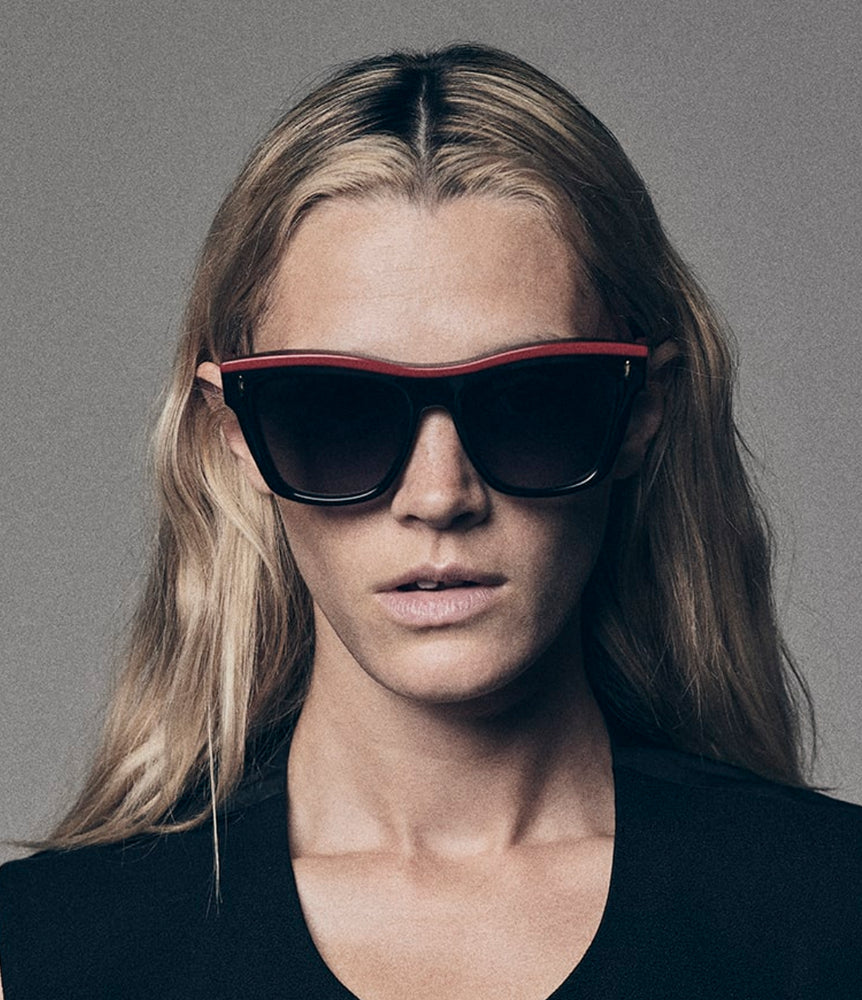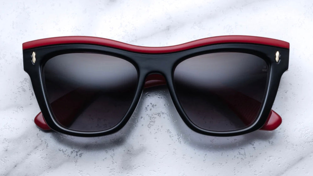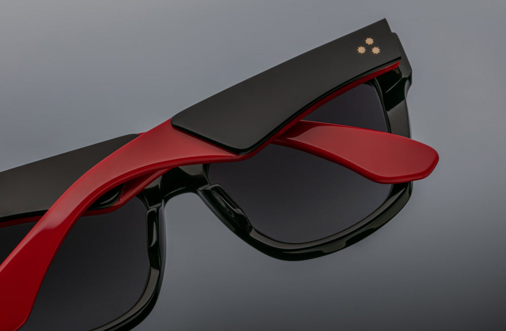 A sophisticated wayfarer-style sunglasses design featuring a bold black acetate frame with striking red accents along the top rim and temple arms. The frame has a substantial, bold presence with thick construction and classic proportions. Silver rivets accent the front corners where the temples meet the frame front. The dark lenses and angular silhouette create a timeless, luxurious aesthetic that bridges vintage and contemporary style. The contrast between the black frame and red details adds a subtle yet distinctive design element.