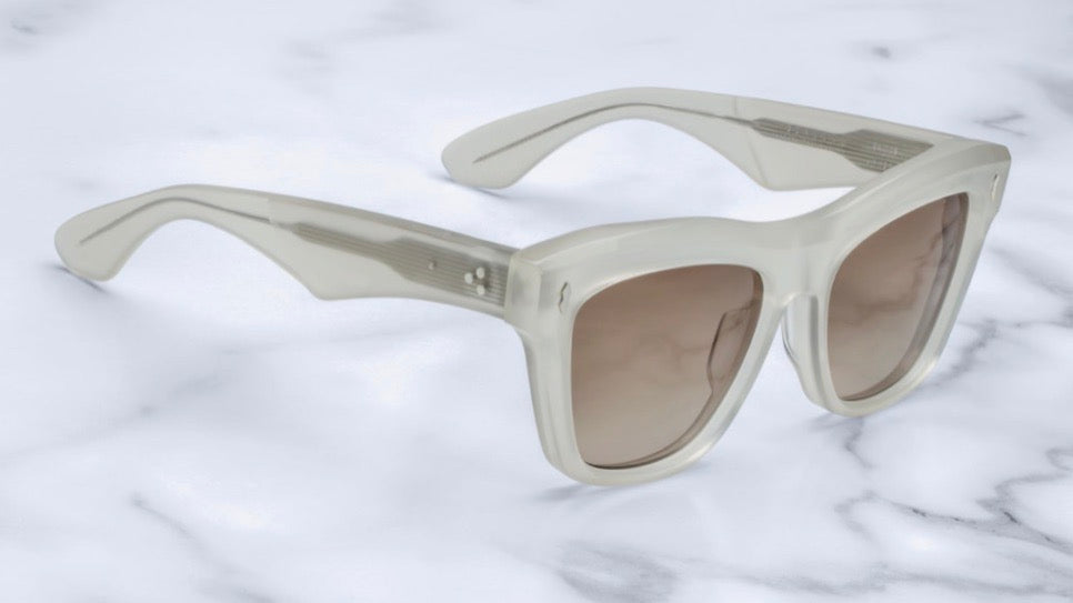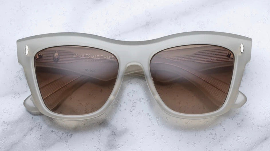 A luxurious pair of Jacques Marie Mage sunglasses featuring a bold square silhouette in a sophisticated matte grey colorway. The substantial acetate frame demonstrates premium craftsmanship with thick, well-defined edges and subtle diamond-shaped metal accents at the temples. The gradient brown lenses complement the frames refined aesthetic. The design showcases clean lines and modernist influences while maintaining a timeless appeal characteristic of the brands signature style.