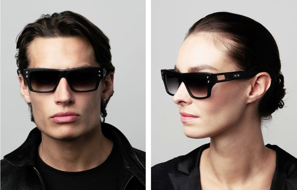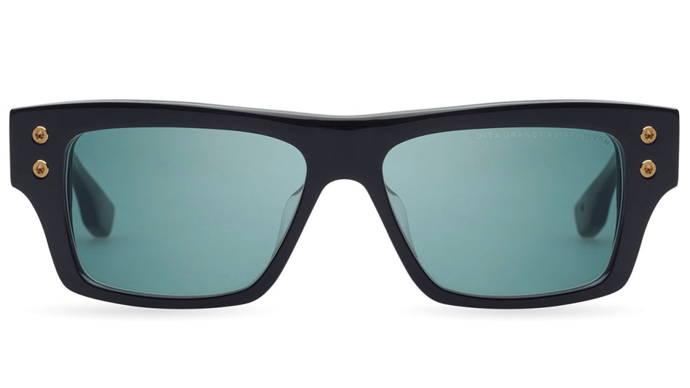 A bold and sophisticated square-framed sunglasses with a chunky black acetate construction. Features distinctive gold-tone hardware accents at the temples, giving it a luxurious touch. The design showcases a clean, architectural aesthetic with strong angular lines and a substantial frame presence. The green-tinted lenses complement the bold frame design, while maintaining a classic, timeless appeal. The frame exhibits excellent craftsmanship with precise detailing and robust construction typical of high-end eyewear.