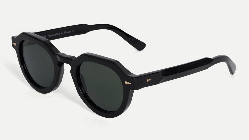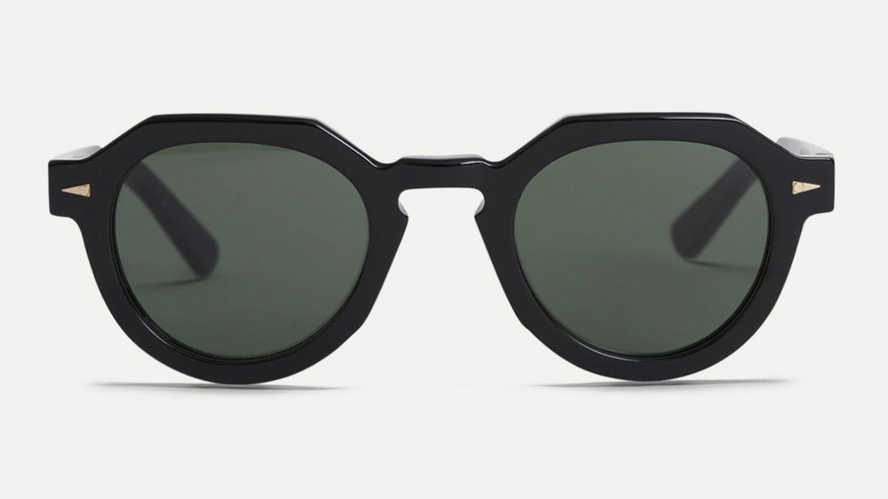 A sophisticated pair of round sunglasses featuring a bold, thick black acetate frame with a vintage-inspired silhouette. The frame has a distinctive architectural quality with clean lines and subtle metallic accents at the temples. The dark green lenses provide excellent sun protection while maintaining a classic aesthetic. The design demonstrates exceptional craftsmanship with its balanced proportions and premium finishing details. Small golden arrow accents on the temples add a refined touch to these timeless sunglasses.
