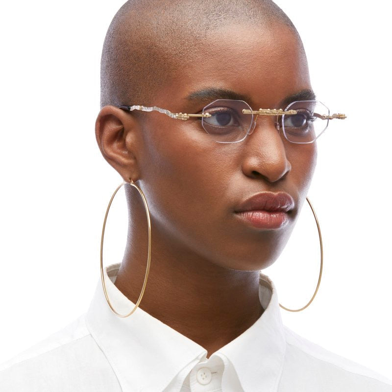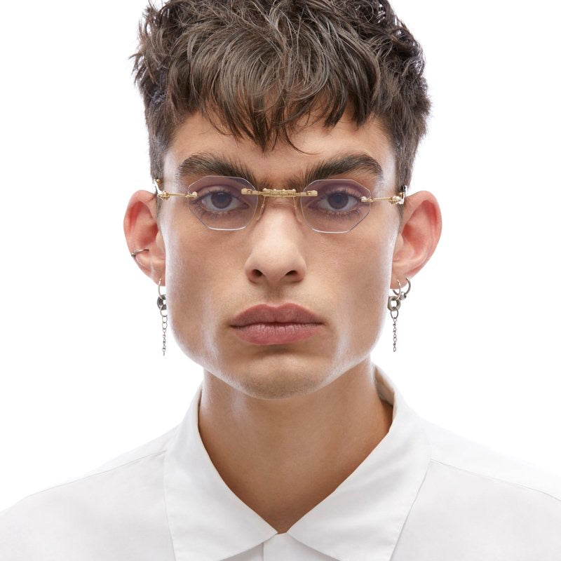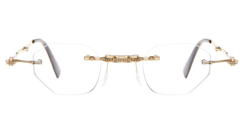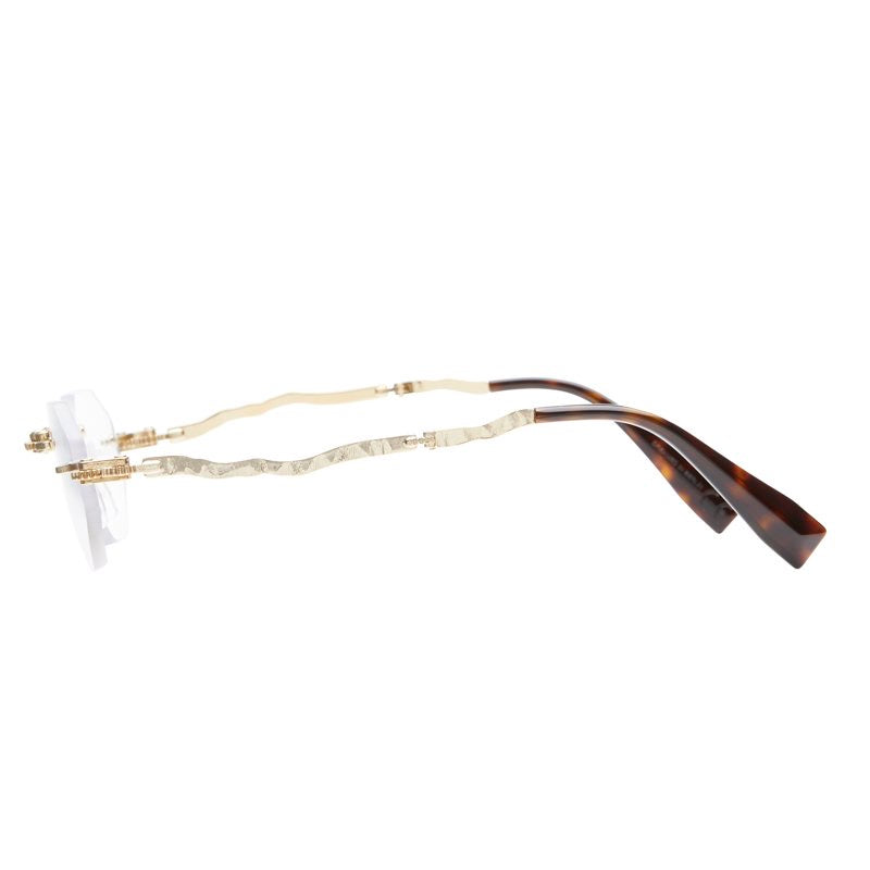 Luxurious rimless eyeglasses with an intricate gold-tone bridge design featuring decorative geometric patterns and flourishes. The frameless design is complemented by delicate metalwork across the top, creating an elegant and sophisticated look. The temples connect seamlessly to the lenses with minimal gold hardware, maintaining a clean and refined aesthetic. The design combines vintage-inspired decorative elements with modern minimalism through its rimless construction.