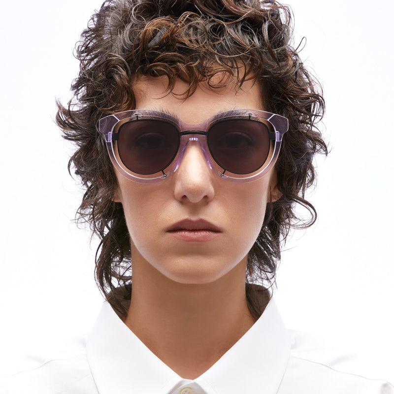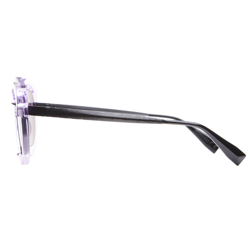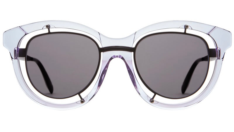 A distinctive pair of avant-garde sunglasses featuring a transparent acetate outer frame with an embedded metallic inner frame. The design showcases a unique double-layered construction with a clear outer rim and metallic accents. The round lenses are held in place by visible screws at strategic points, creating an industrial-meets-luxury aesthetic. The transparent frame creates a floating effect for the dark grey lenses, while the metallic elements add a contemporary, architectural dimension to the design. The construction appears both robust and sophisticated, with careful attention to detail in the bridge and temple connections.