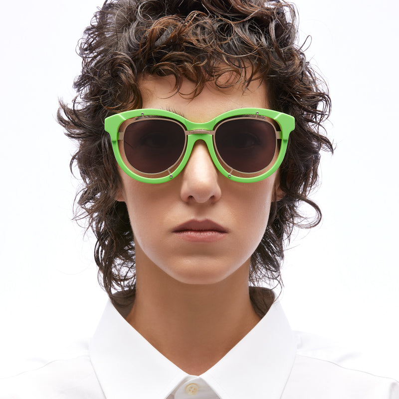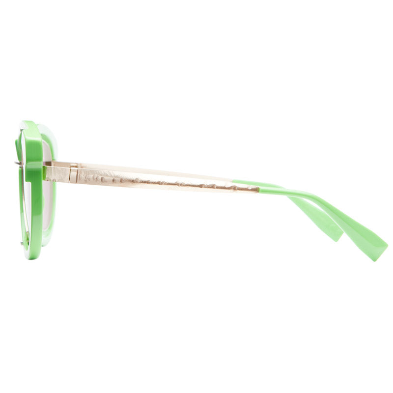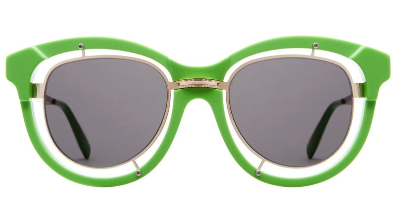 These are bold, oversized round sunglasses featuring a distinctive thick green plastic frame with metallic gold accents. The design incorporates an interesting architectural element where the frame appears to have a floating effect created by metal hardware attachments visible at key points. The grey-tinted lenses are surrounded by a white inner rim that creates a striking contrast against the green outer frame. The overall aesthetic is avant-garde and fashion-forward, making these sunglasses a strong statement piece. The construction appears quite sturdy with high-quality finishing details and hardware connections visible at the temples and bridge.