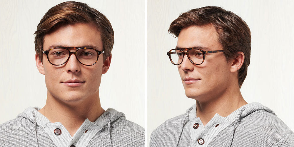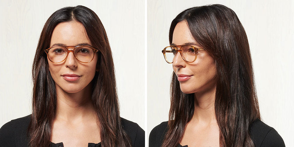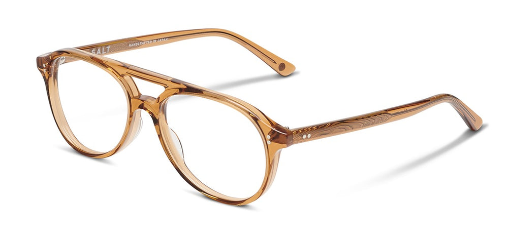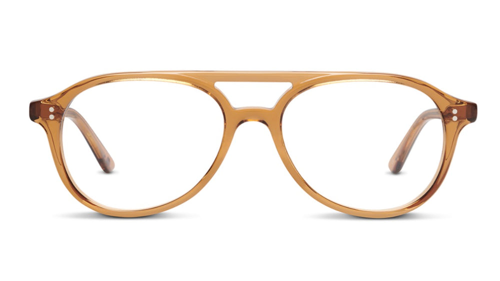 These are sophisticated aviator-style glasses featuring a translucent amber/orange acetate frame with a distinctive double bridge design. The frame has a retro-inspired shape with rounded lenses and a sturdy build. The temple arms smoothly integrate into the front frame, creating a cohesive look. The glasses exhibit excellent craftsmanship with clean lines and a modern interpretation of a classic style.