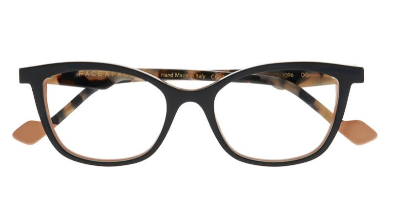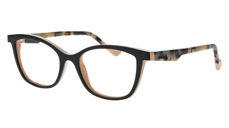 These sophisticated Italian-made cat-eye frames feature a sleek black front frame with contrasting brown temple arms. The design showcases a modern take on the classic cat-eye silhouette with clean lines and subtle angles. The frame has a professional yet fashionable look with a medium thickness and a well-balanced proportion. The tortoise pattern accent on the temple adds an elegant touch to the overall design. Made with high-quality Italian craftsmanship, these glasses combine style with durability and comfort.