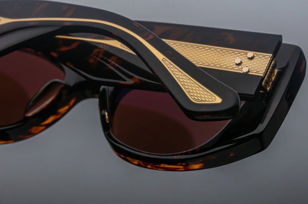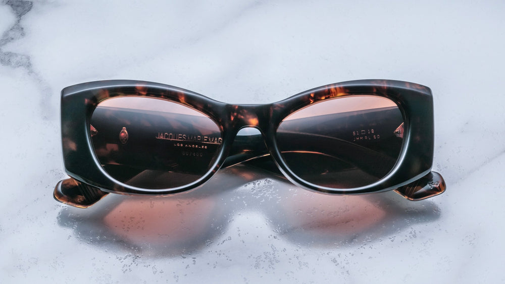 A luxurious pair of chunky, bold rectangular sunglasses from Jacques Marie Mages Los Angeles collection. The frames feature a sophisticated tortoiseshell pattern with warm brown and amber tones throughout. The oversized silhouette and substantial acetate construction gives these sunglasses a premium, statement-making appearance typical of high-end designer eyewear. The temple arms flow seamlessly from the front frame, maintaining the same substantial thickness and tortoiseshell pattern. The saddle bridge is well-proportioned to balance the bold frame design.