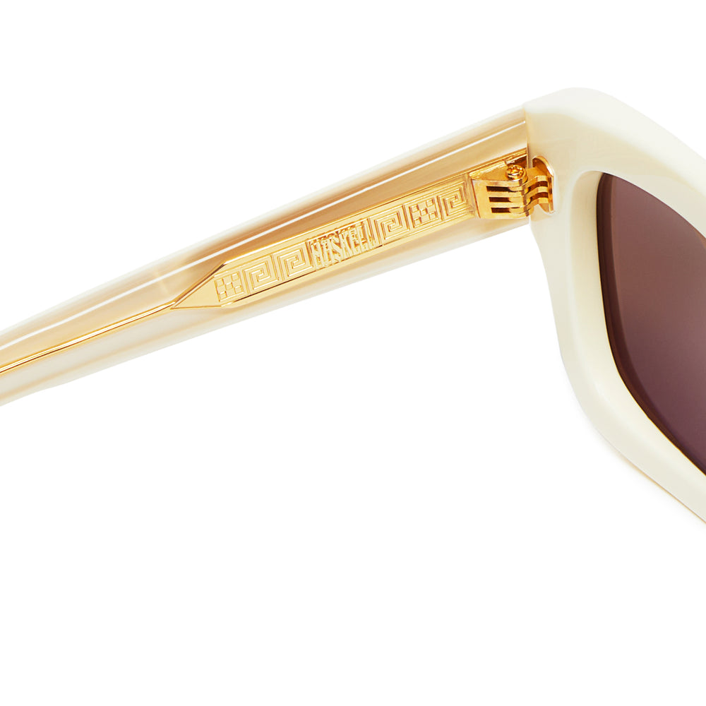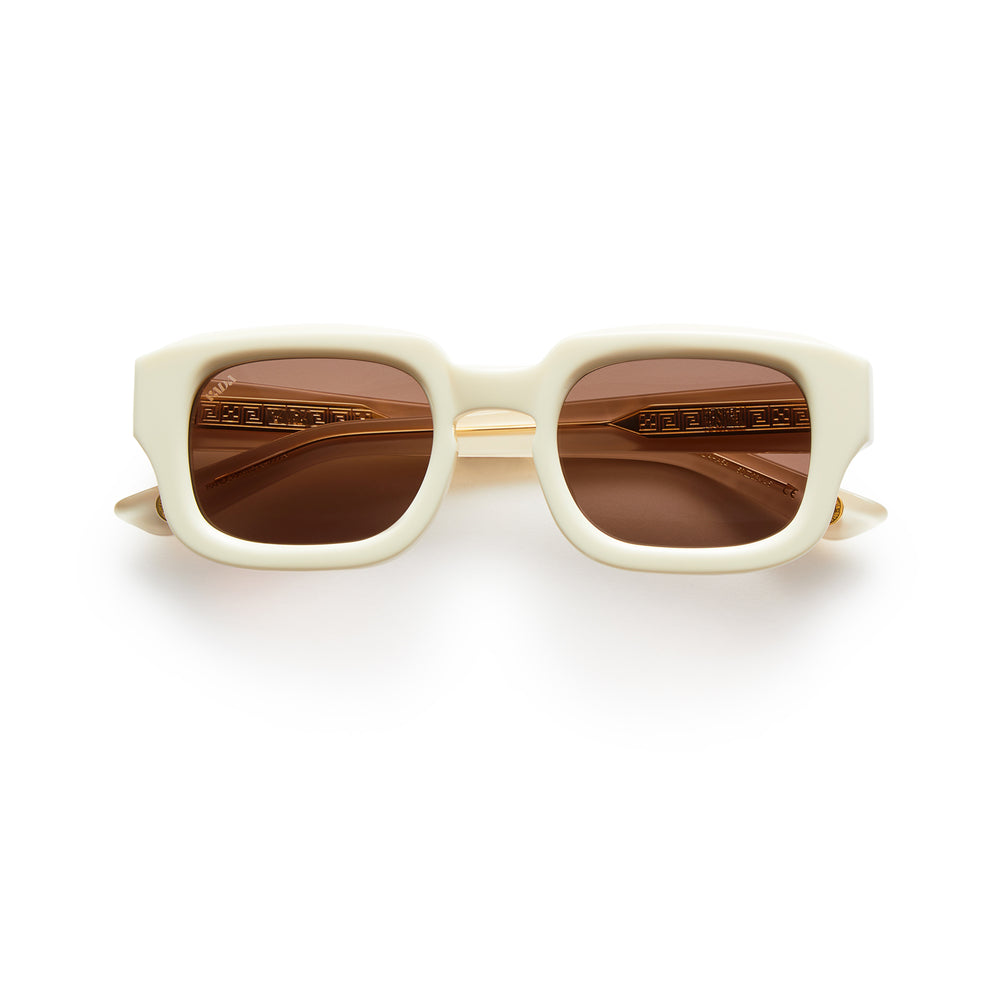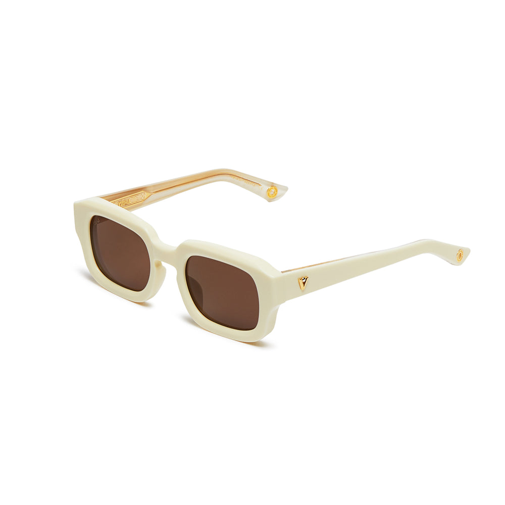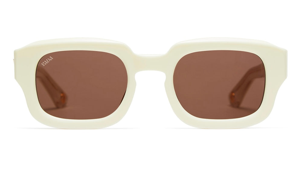 These are bold retro-inspired chunky sunglasses featuring an oversized square silhouette with thick white plastic frames. The brown-tinted lenses create a striking contrast against the creamy white frame. The design has a vintage 70s aesthetic with clean geometric lines and substantial temple arms that match the frame color. The VADA branding is subtly visible on the lens corner, and the overall construction appears sturdy and fashion-forward.