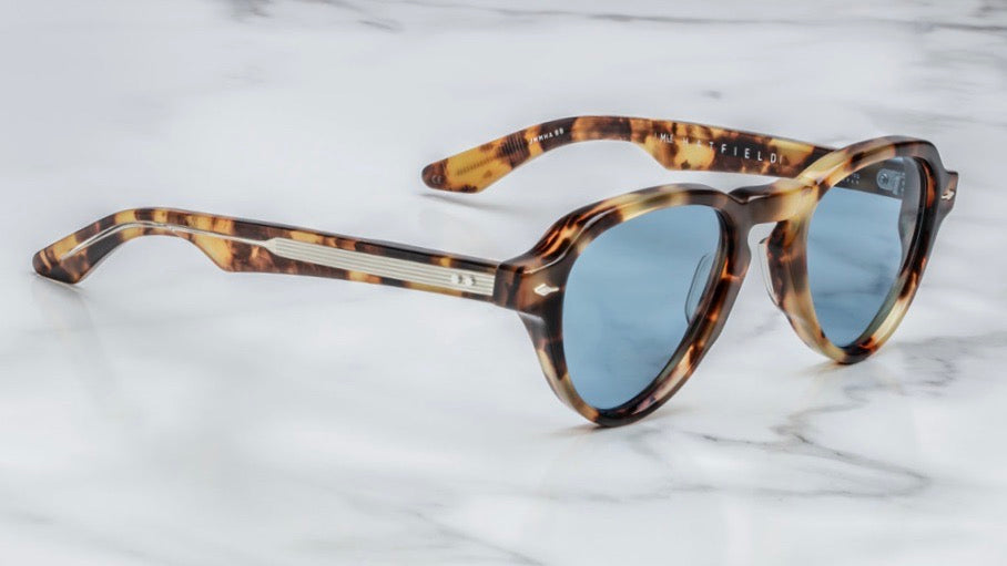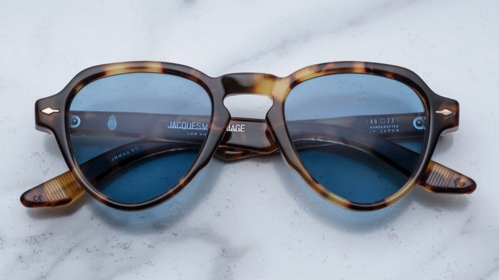 A sophisticated pair of Jacques Marie Mage round-framed sunglasses featuring a classic tortoiseshell acetate frame pattern. The design showcases a medium-weight construction with elegant proportions and blue-tinted lenses. The sunglasses embody a vintage-inspired aesthetic with modern refinement, featuring smooth curves and a well-balanced saddle bridge. The tortoiseshell pattern exhibits beautiful variations of amber and dark brown tones throughout the frame and temple arms, creating a luxurious, timeless appearance.