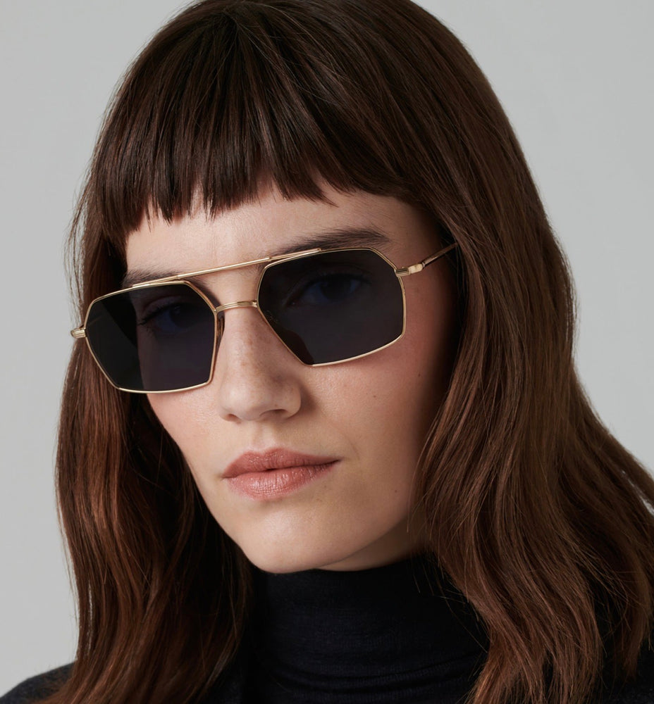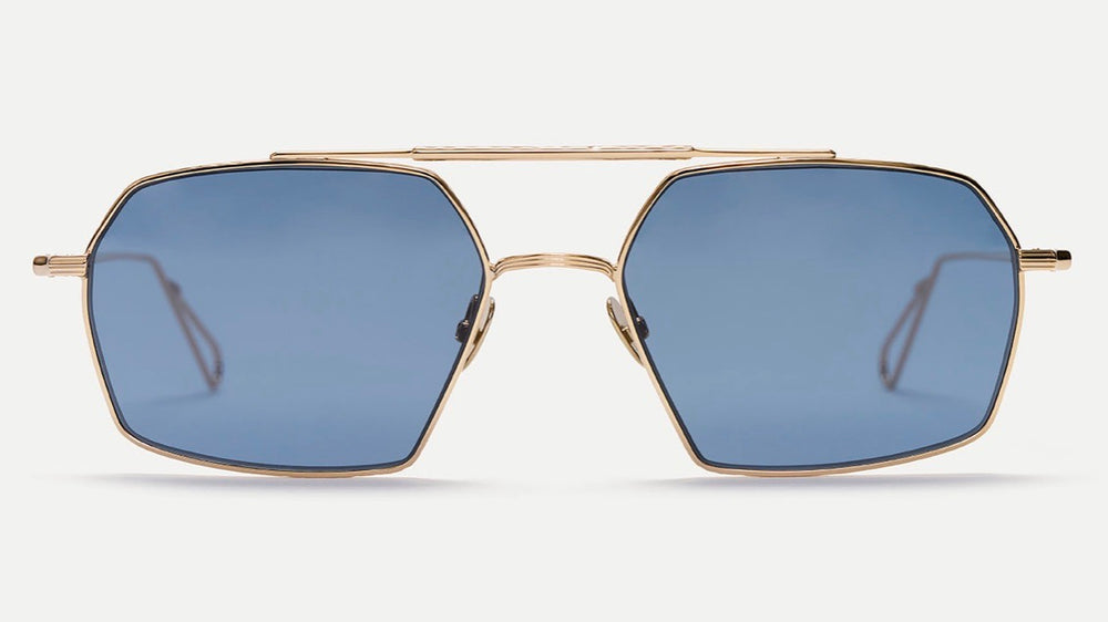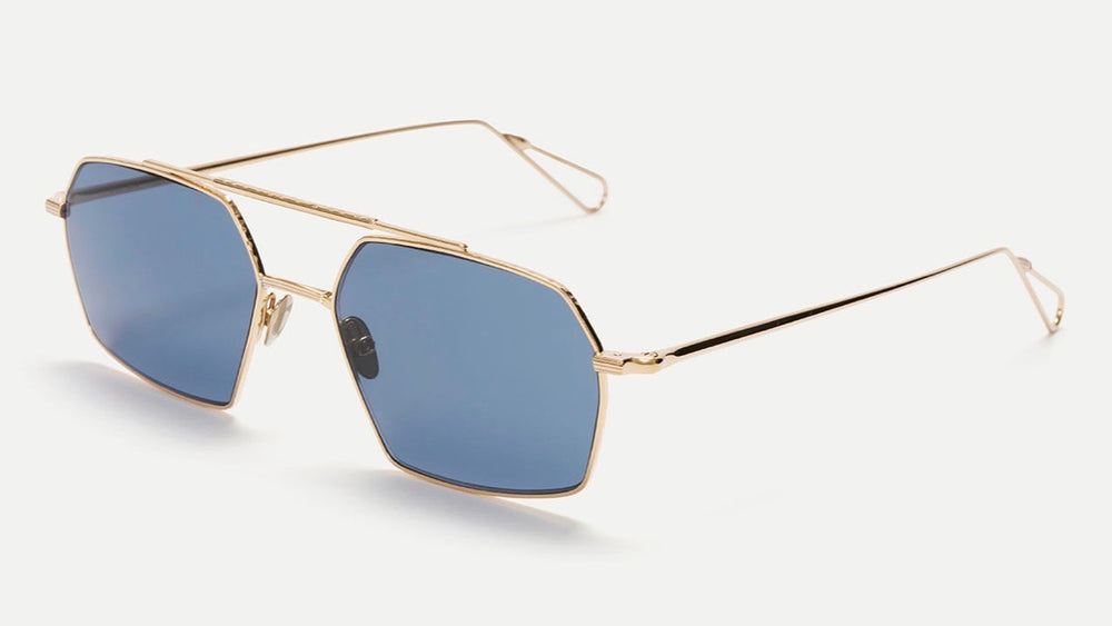 A sophisticated pair of geometric sunglasses featuring a distinctive gold-tone metal frame with an architectural double bridge design. The angular hexagonal lenses in a cool blue tint are complemented by slim temple arms and minimalist nose pads. The design exhibits a refined balance between contemporary geometric shapes and classic elegance, with clean lines and precise angles that create a distinctly modern silhouette. The elegant proportions and premium construction suggest high-end craftsmanship typical of luxury eyewear.