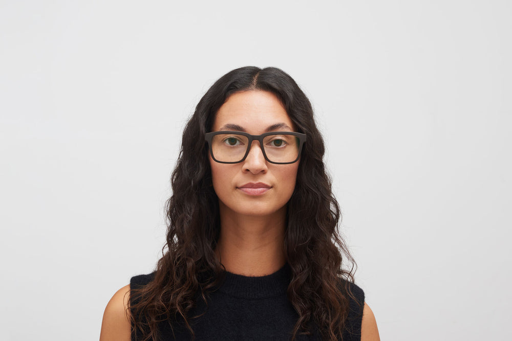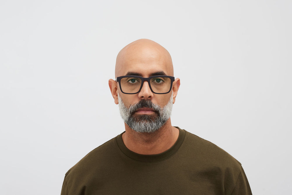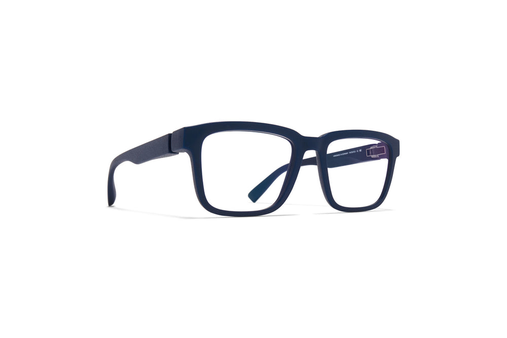 Contemporary square glasses with a bold, minimalist design featuring a matte navy blue finish throughout. The frames have a substantial, architectural presence with clean geometric lines and a modern aesthetic. The temple arms appear to have a textured or slightly different finish compared to the front frame. The overall design suggests a sophisticated, professional look suitable for everyday wear.