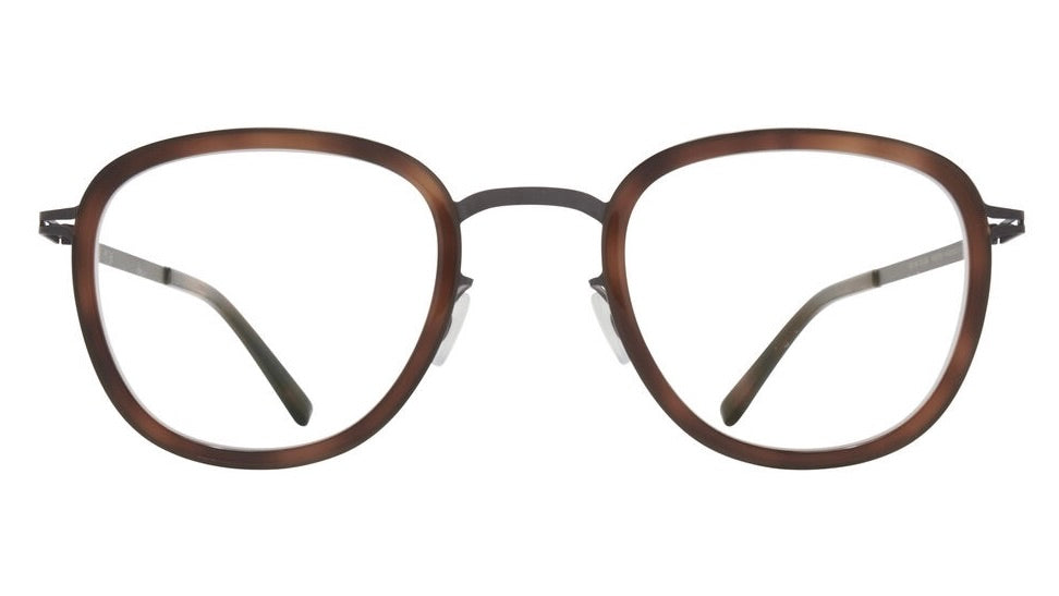 These sophisticated round eyeglasses feature a distinctive brown acetate rim surrounding metal frames, creating an elegant fusion of materials. The design showcases a refined bronze-colored metal bridge and temple arms with minimalist styling. The frames have a classic vintage-inspired silhouette with modern engineering, exemplified by the sleek nose pads and clean lines throughout. The overall aesthetic is understated yet luxurious, perfect for the fashion-conscious professional seeking a timeless look.