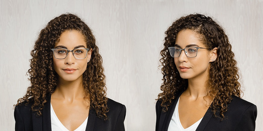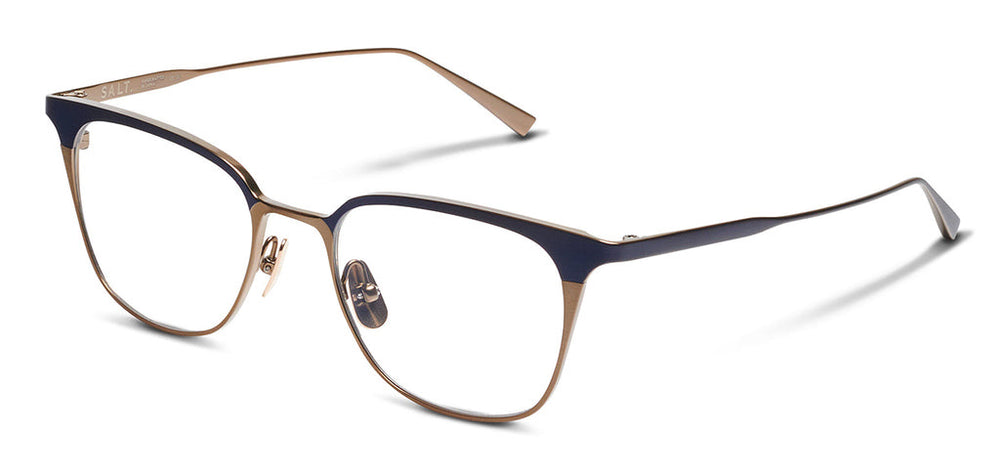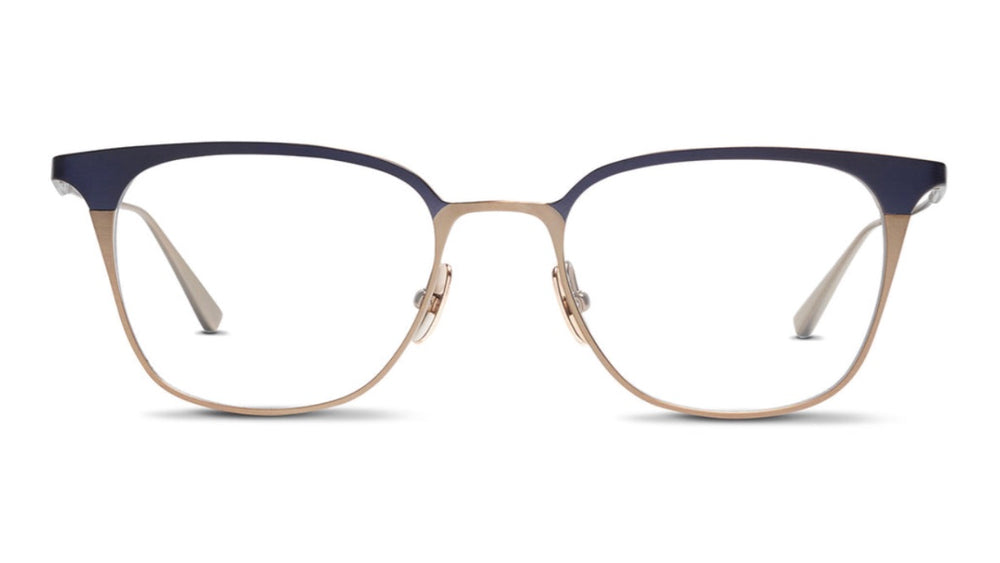 Sophisticated two-tone metal frames featuring a navy blue upper rim that transitions elegantly into a warm bronze/rose gold lower section. The glasses showcase a contemporary geometric silhouette with clean lines and a minimalist aesthetic. The thin metal construction creates a lightweight, refined appearance ideal for professional or casual wear. The design demonstrates excellent attention to detail with perfectly balanced proportions and subtle metallic finishes that catch the light beautifully.