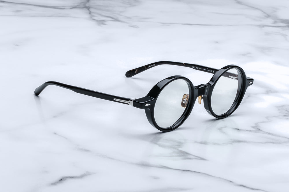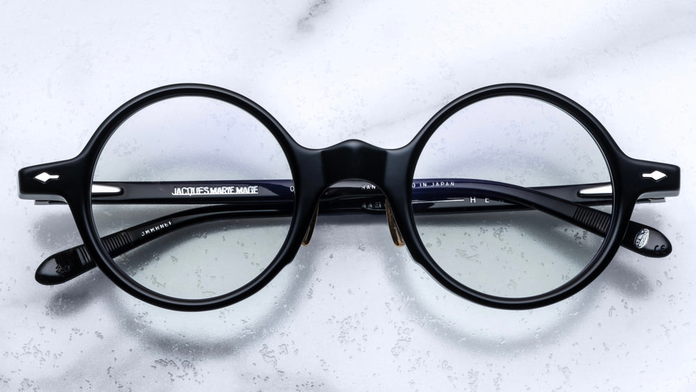 Sophisticated round-framed Jacques Marie Mage eyeglasses featuring a bold thick acetate construction. The design showcases a classic circular silhouette with a prominent saddle bridge. Made in Japan with exceptional attention to detail, these frames exhibit a refined vintage-inspired aesthetic with modern luxury touches. Small arrow details adorn the temple hinges, and the frames have a substantial, high-quality feel with clean lines and perfect proportions.