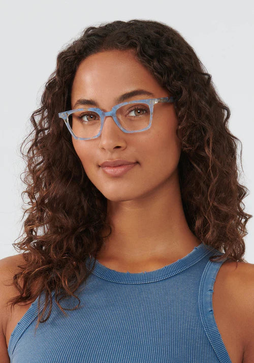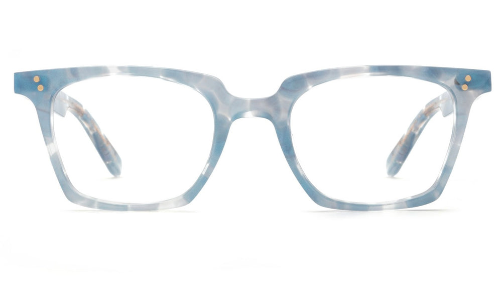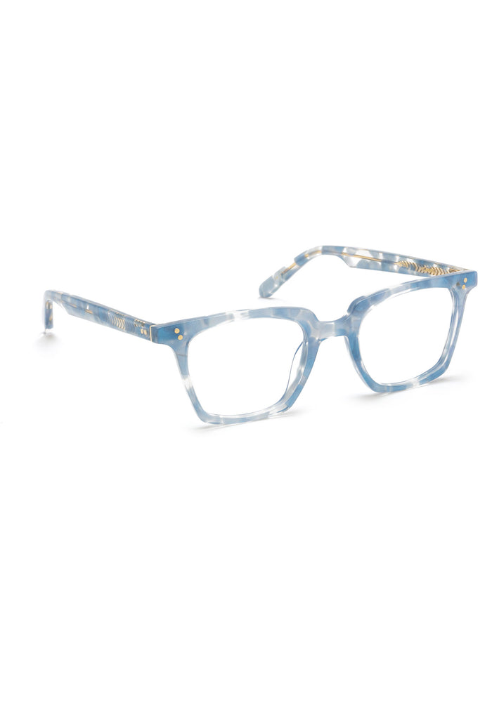 Modern square-framed glasses with a marbled light blue and white pattern throughout. The frames have a distinctive geometric shape with slightly angular corners and small metallic rivets on the front corners. The acetate material has a translucent, cloudy appearance reminiscent of a serene sky with wisps of clouds. The design combines contemporary styling with classic proportions, featuring clean lines and a sophisticated matte finish that would complement both casual and professional attire.