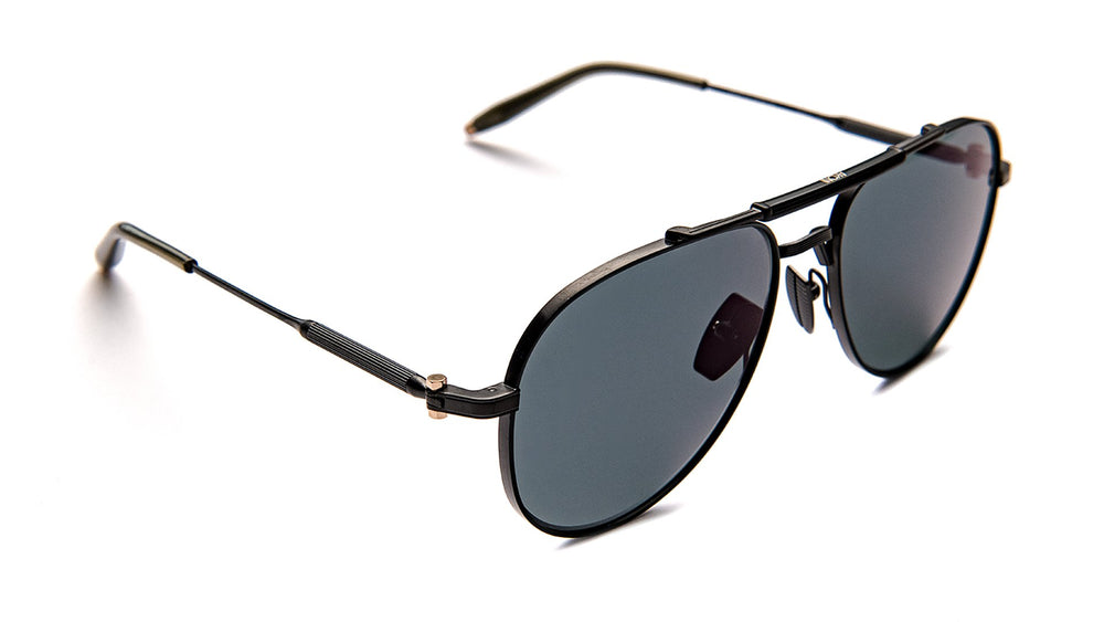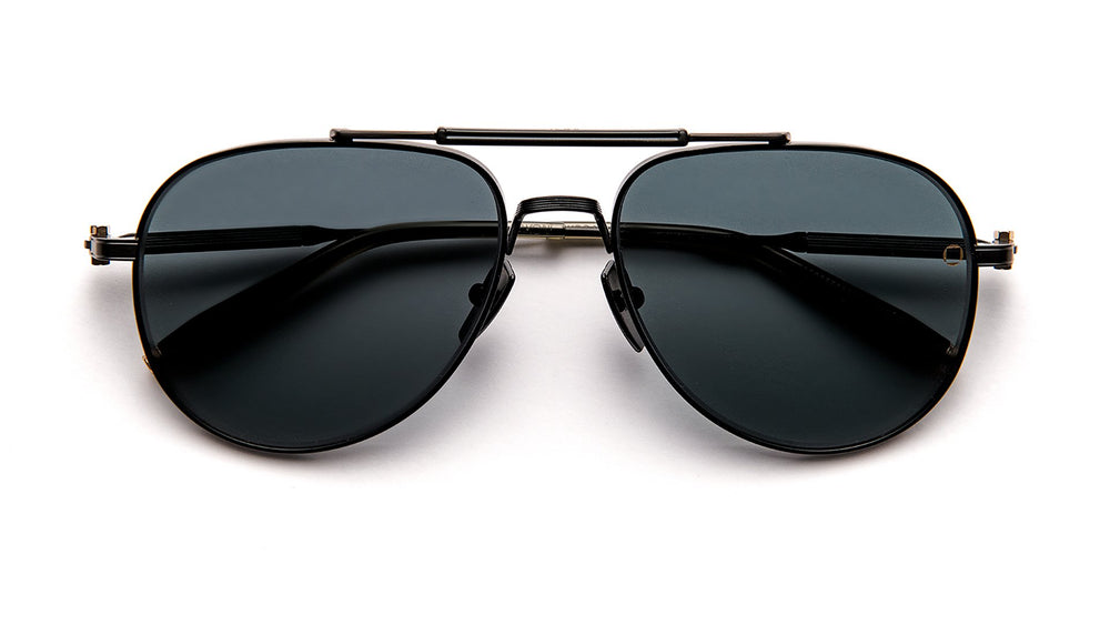 Classic aviator sunglasses featuring a sleek black metal frame with a distinctive double bridge design. The frame exhibits premium craftsmanship with thin, elegant lines and adjustable nose pads for comfort. The dark tinted lenses are complemented by slim temple arms that create a sophisticated, timeless look. The sunglasses strike a perfect balance between modern styling and traditional aviator aesthetics, making them suitable for various face shapes and occasions.