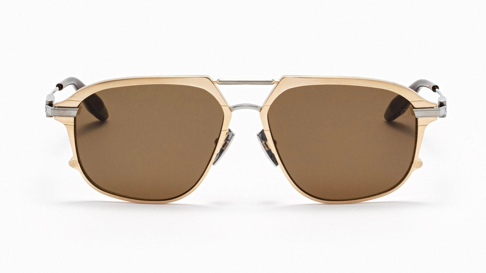 These are sophisticated geometric sunglasses featuring a sleek gold-toned metal frame with a distinctive angular shape. The design combines modern styling with classic elements, featuring brown-tinted lenses and delicate nose pads. The frame has a refined double-bar bridge detail and slim temple arms that create an elegant, contemporary silhouette. The sunglasses exhibit premium craftsmanship with their precise metalwork and balanced proportions, making them suitable for both formal and casual occasions.