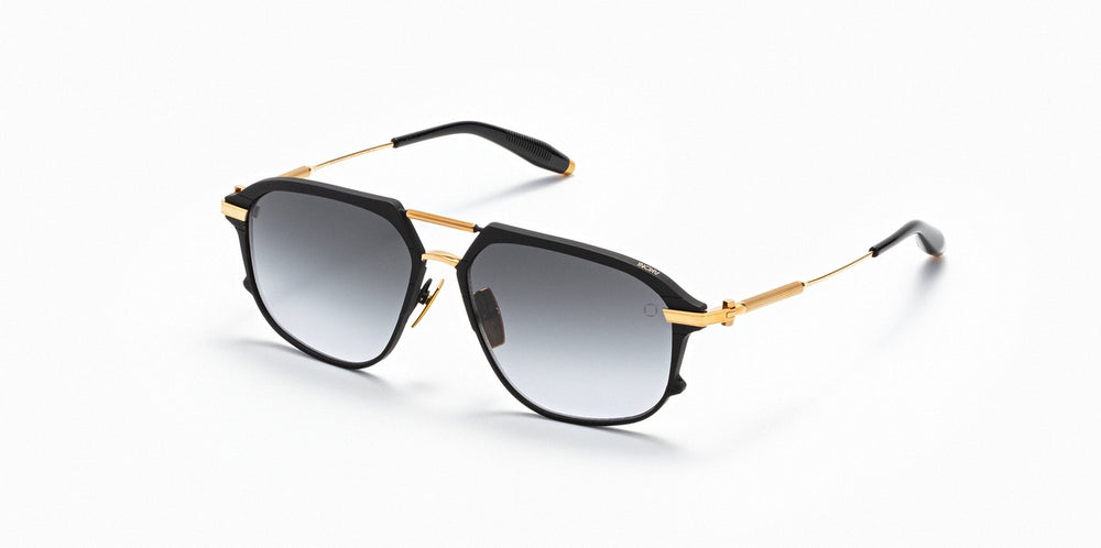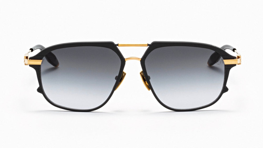 These luxurious aviator-inspired sunglasses feature a sophisticated geometric shape with a matte black metal frame and gold accents. The design combines modern aesthetics with classic elements, featuring gradient grey lenses and sleek nose pads. The thin profile and mixed metal construction creates an elegant, high-end appearance suitable for both casual and formal wear. The frame demonstrates excellent craftsmanship with its precise angles and smooth transitions between materials.