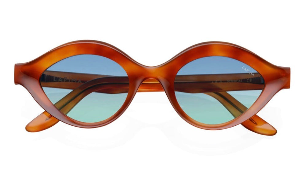 Stylish retro-inspired oval sunglasses with a distinctive tortoise acetate frame in warm amber tones. Features a smooth curving silhouette with gradient blue-tinted lenses. The design showcases elegant proportions with seamlessly integrated temple arms and a classic saddle bridge. The frame exhibits a sophisticated matte finish that adds to its vintage appeal while maintaining a contemporary edge.