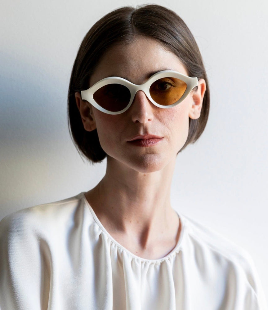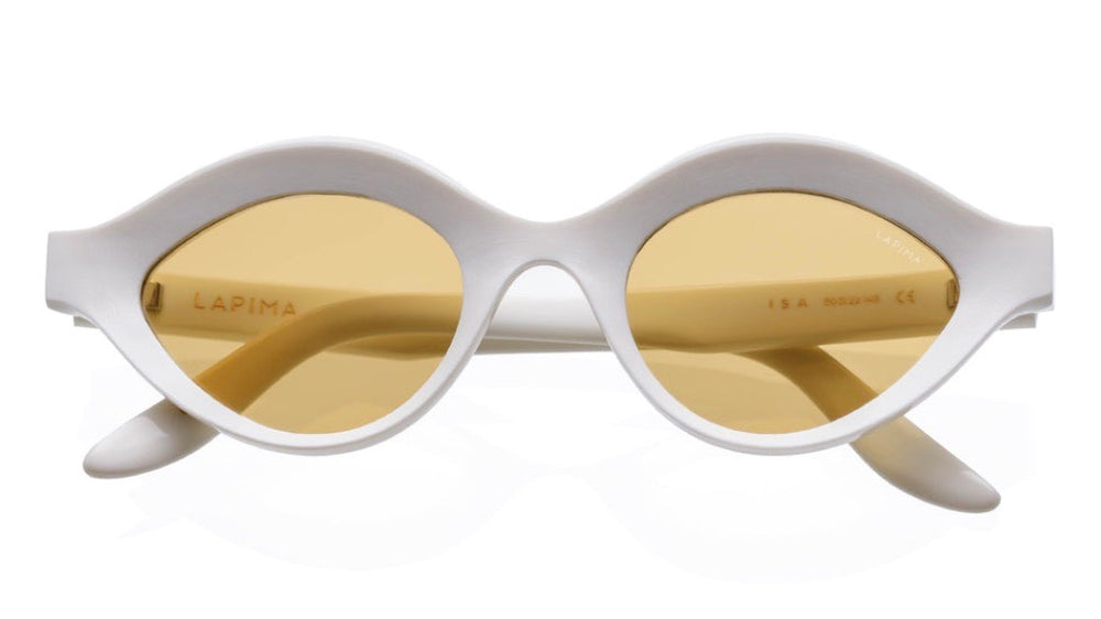 Retro-inspired oval sunglasses with a distinctive thick white plastic frame and yellow-tinted lenses. The design features a minimalist aesthetic with smooth, curved lines and a bold silhouette that makes a fashion statement. The LAPIMA ISA model demonstrates clean, architectural styling with well-balanced proportions and a modern take on vintage eyewear design. The monochromatic white frame construction creates a cohesive look from front to temples.
