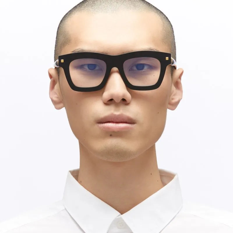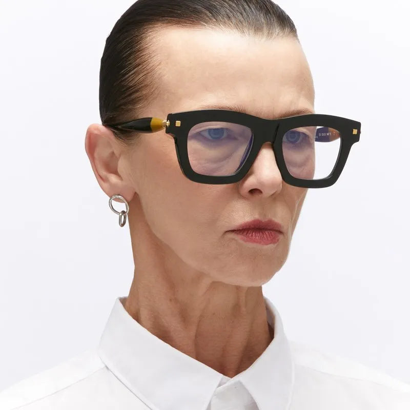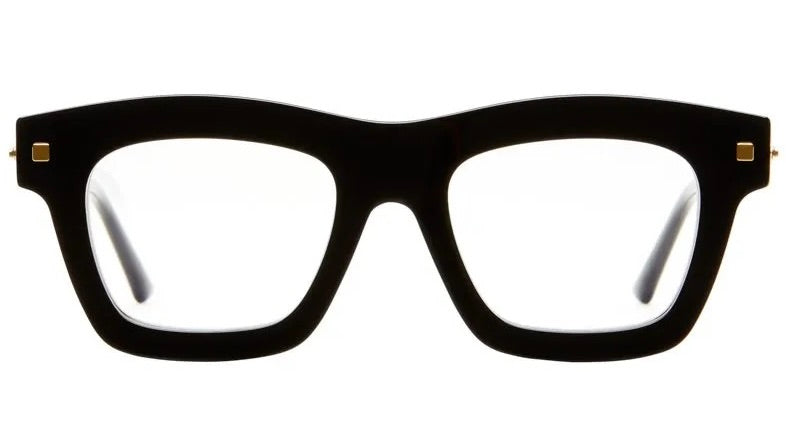 These are bold, avant-garde geometric frames featuring an extremely thick, statement-making black acetate construction. The frames have a distinctive architectural quality with sharp, angular lines and a pronounced rectangular/geometric shape. Small gold-tone metal accents appear at the temples, adding a subtle luxury detail to the otherwise minimalist design. The bridge is integrated seamlessly into the hefty frame front, creating a solid, monolithic appearance. These glasses make a strong fashion statement with their oversized proportions and brutalist aesthetic, characteristic of KUBORAUMs distinctive design approach.