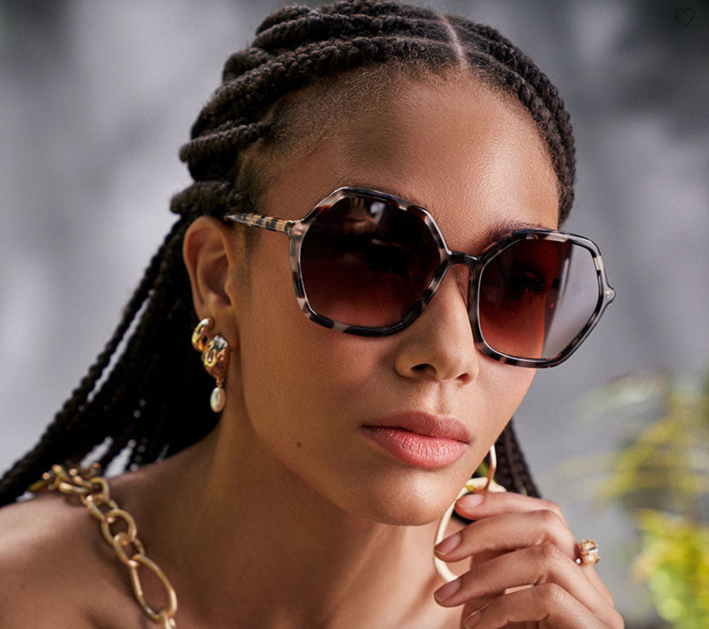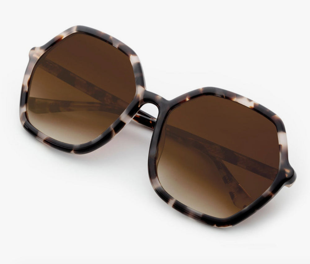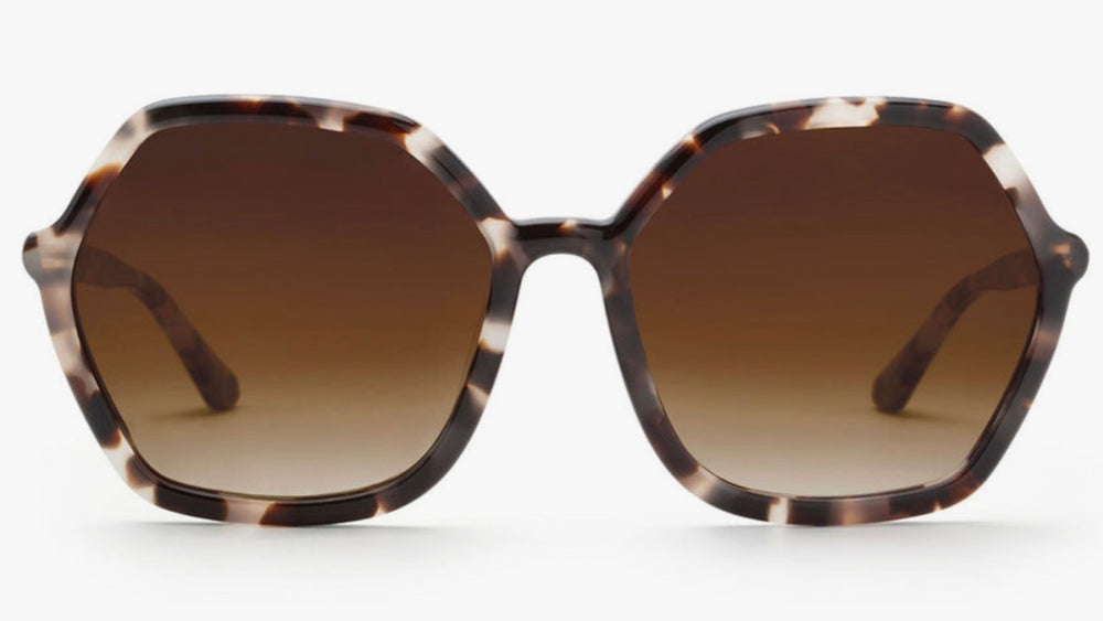 Contemporary oversized geometric sunglasses featuring a luxurious tortoiseshell acetate frame pattern in brown and beige tones. The distinctive angular silhouette is complemented by gradient brown lenses, creating an elegant and sophisticated look. The frame exhibits a well-balanced design with smooth transitions between the thick temples and front frame. The saddle bridge provides comfortable fit while maintaining the frames bold aesthetic presence.