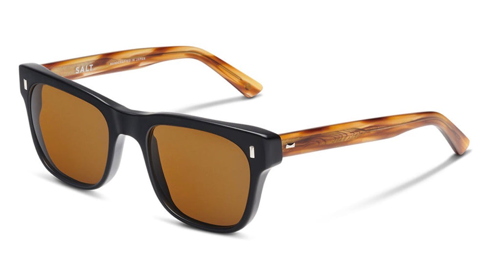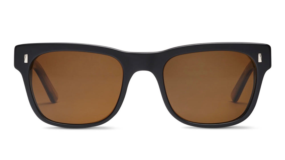 Classic wayfarer-style sunglasses with a substantial matte black plastic frame and warm brown-tinted lenses. The design features clean lines and minimal branding with small metal accents at the temples. The squared-off rectangular shape has a timeless appeal that would suit many face shapes. The frame has a sophisticated yet casual look with its balanced proportions and versatile colorway.