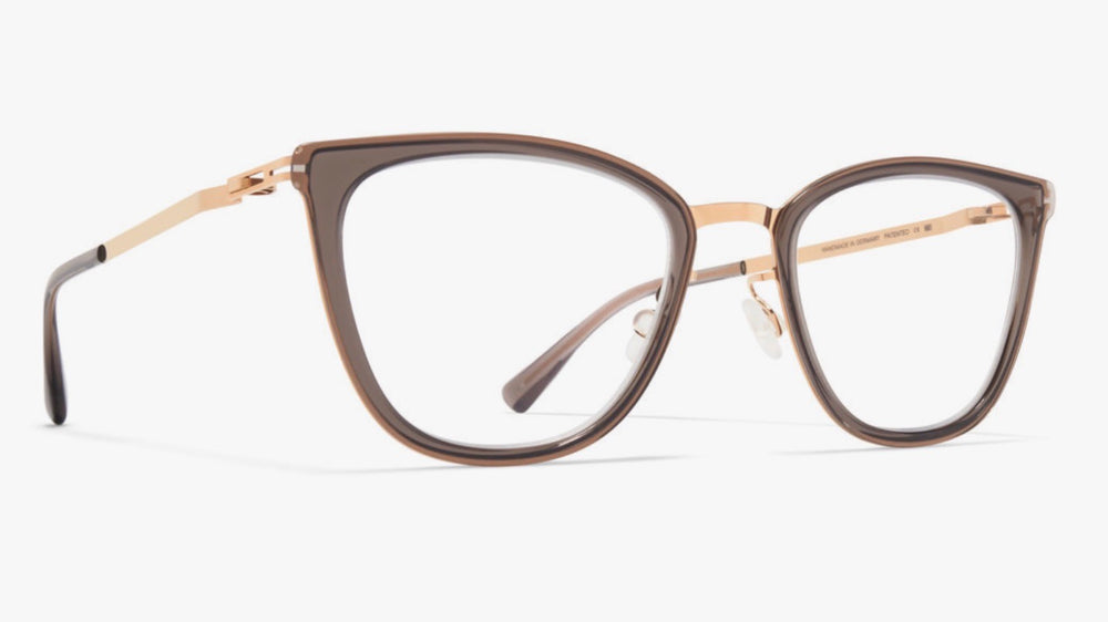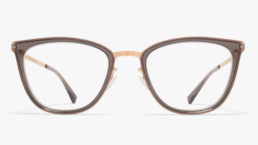 These are elegant cat-eye glasses featuring a sophisticated grey acetate front frame with lustrous gold metal accents along the bridge and temple arms. The design combines modern minimalism with classic feminine styling, featuring a sleek profile and clean lines. The frame has a translucent grey finish that gives it a contemporary feel while maintaining professional sophistication. The thin gold metal temple arms and bridge add a luxurious touch to the overall design.