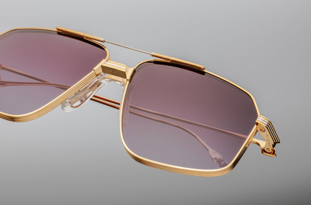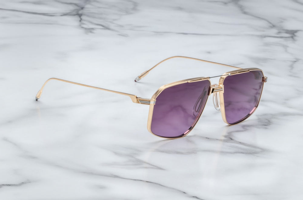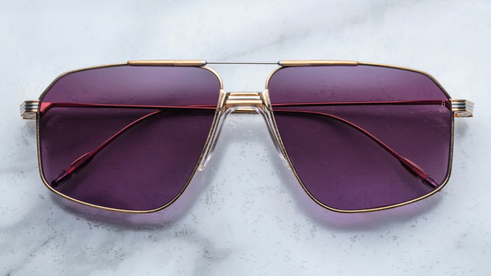 These are luxurious aviator-style sunglasses with a sophisticated gold metal frame and deep purple-tinted lenses. The design features elegant double bridge construction with delicate nose pads and thin temple arms with decorative detailing. The frame has a refined architectural quality with clean lines and subtle vintage-inspired elements, making it a timeless and sophisticated accessory. The proportions are well-balanced, and the construction appears to be of premium quality.