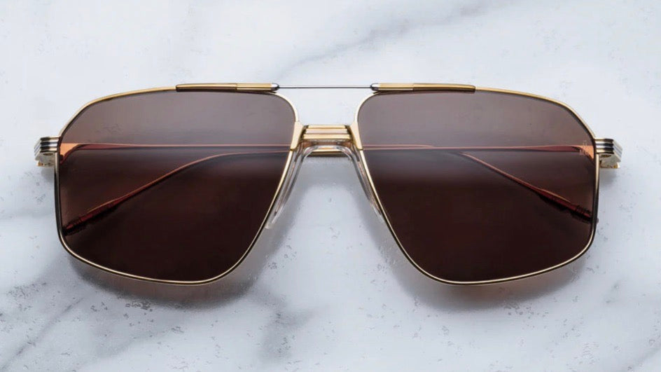 Luxurious vintage-inspired aviator sunglasses with a sophisticated double-bridge design. The frames feature a sleek gold-tone metal construction with refined geometric angles and subtle architectural details. The brown-tinted lenses complement the metallic finish, while the classic aviator silhouette is updated with modern proportions and premium craftsmanship. The temple arms showcase delicate ribbed detailing, adding a touch of industrial elegance to the design.