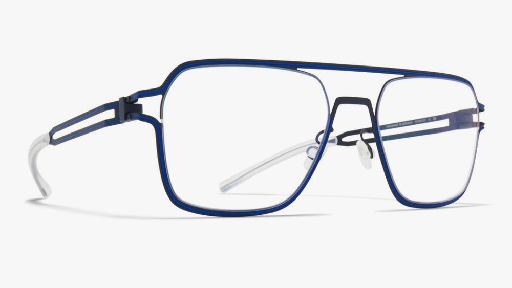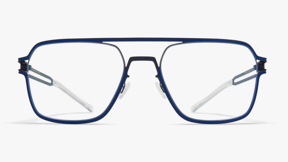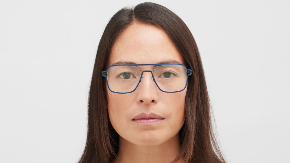 Modern aviator-inspired design with distinctive geometric angles and clean lines. Features a sleek metallic blue frame with architectural detailing on the temple arms. The double bridge design adds a sophisticated technical element while maintaining a lightweight, contemporary aesthetic. The frame has a refined mix of straight edges and subtle curves that create an avant-garde look suitable for professional settings.
