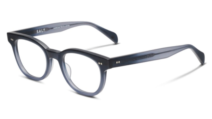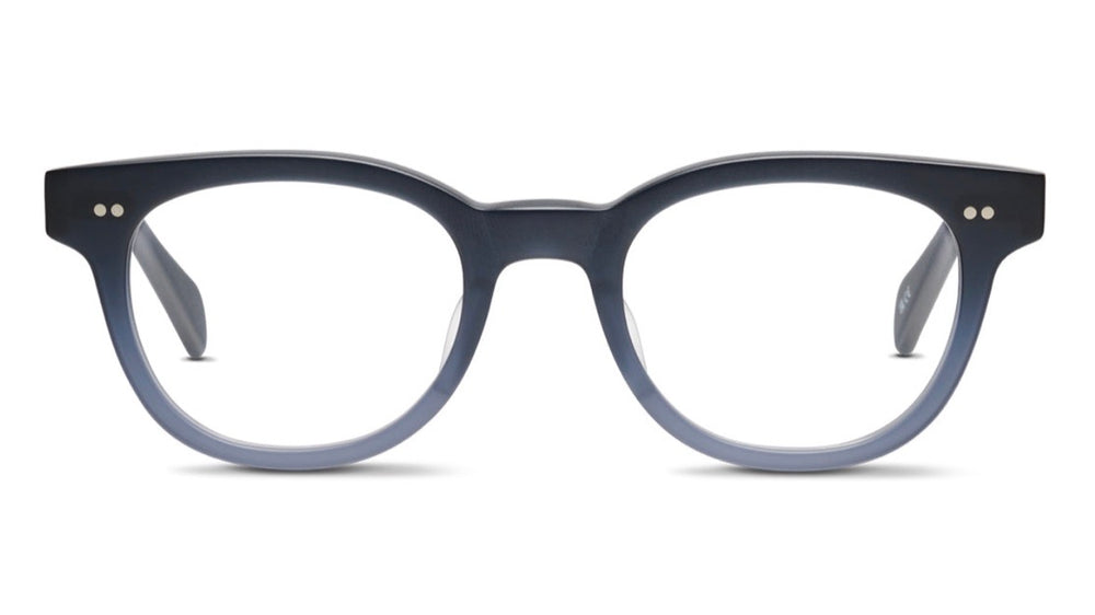 A sophisticated pair of eyeglasses featuring a gradient blue-to-grey acetate frame in a modern square silhouette. The frame exhibits a subtle ombre effect, transitioning from a deeper navy at the top to a softer grey-blue at the bottom. The design includes minimal metal rivets on the front corners, adding a refined detail to the otherwise clean aesthetic. The frame has a contemporary feel with its medium thickness and classic proportions, making it versatile for various face shapes. The saddle bridge provides comfortable weight distribution, while the substantial temple arms ensure durability and stability.