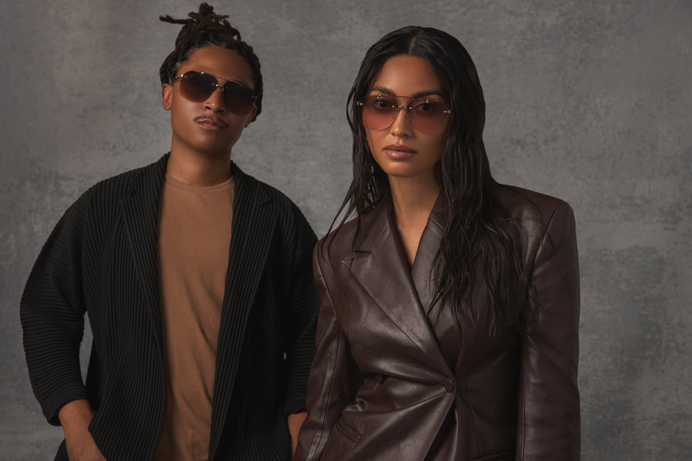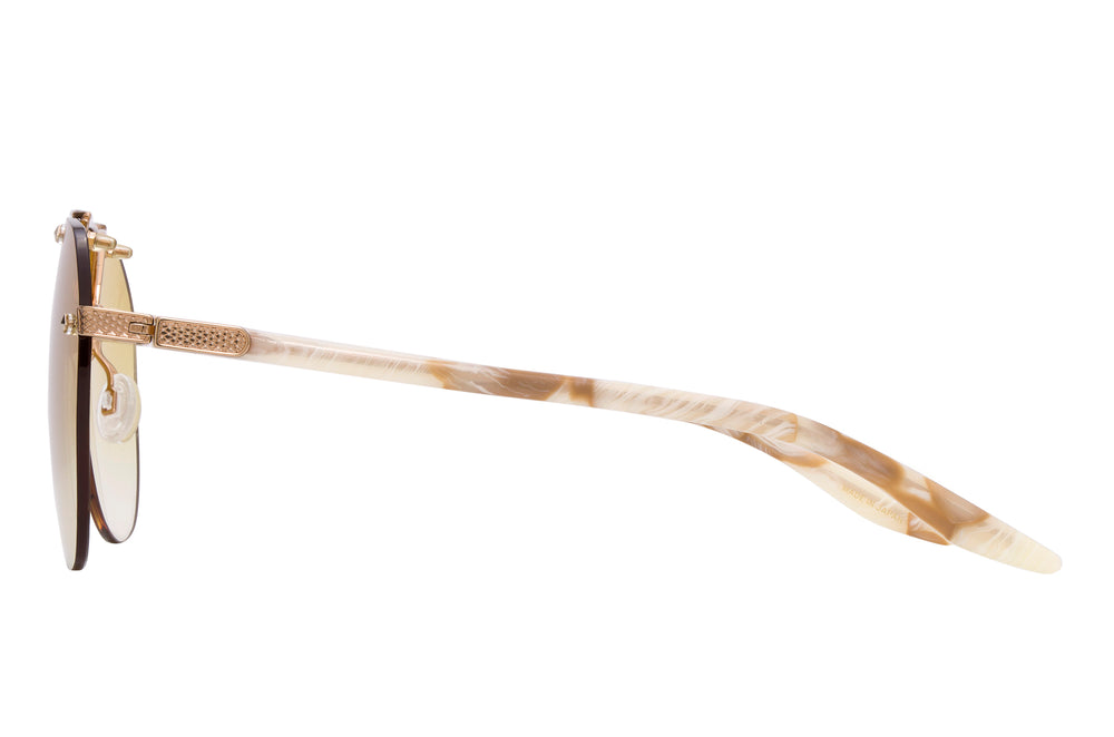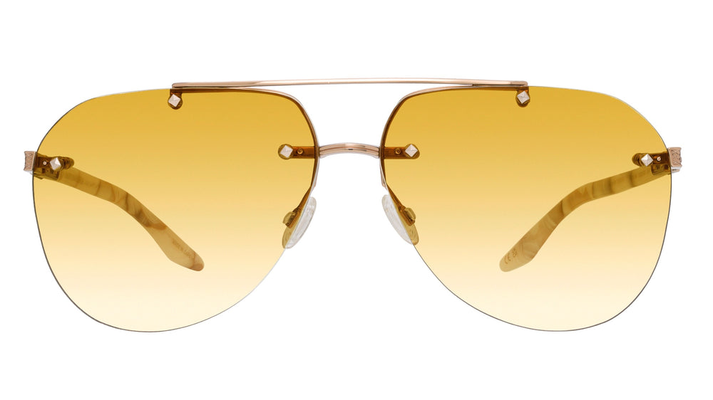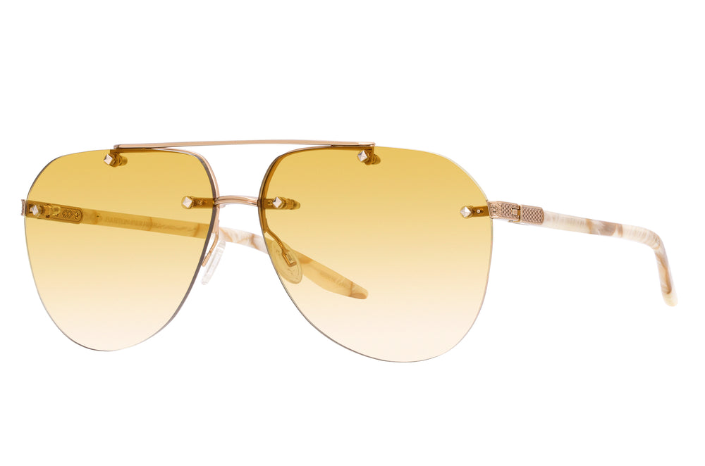 These are luxurious aviator-style sunglasses with a sleek gold metal frame and gradient yellow-tinted lenses. The frameless bottom design gives them a modern, minimalist aesthetic. The glasses feature delicate nose pads and thin temple arms with subtle decorative rivets at the lens attachment points. The overall design strikes a perfect balance between classic aviator styling and contemporary luxury, with high-quality craftsmanship evident in the precise metalwork and lens mounting.