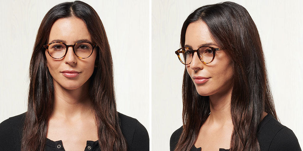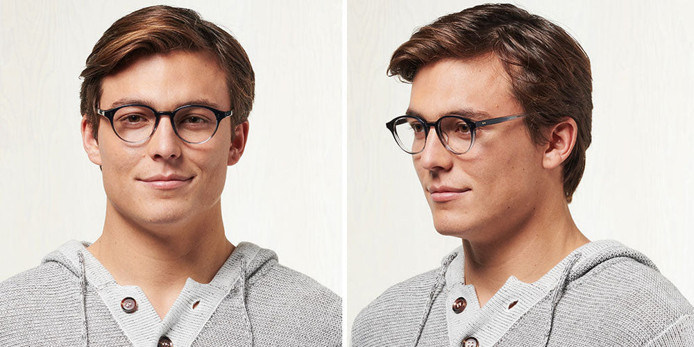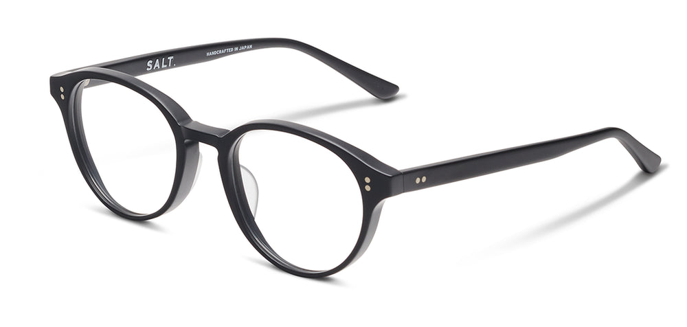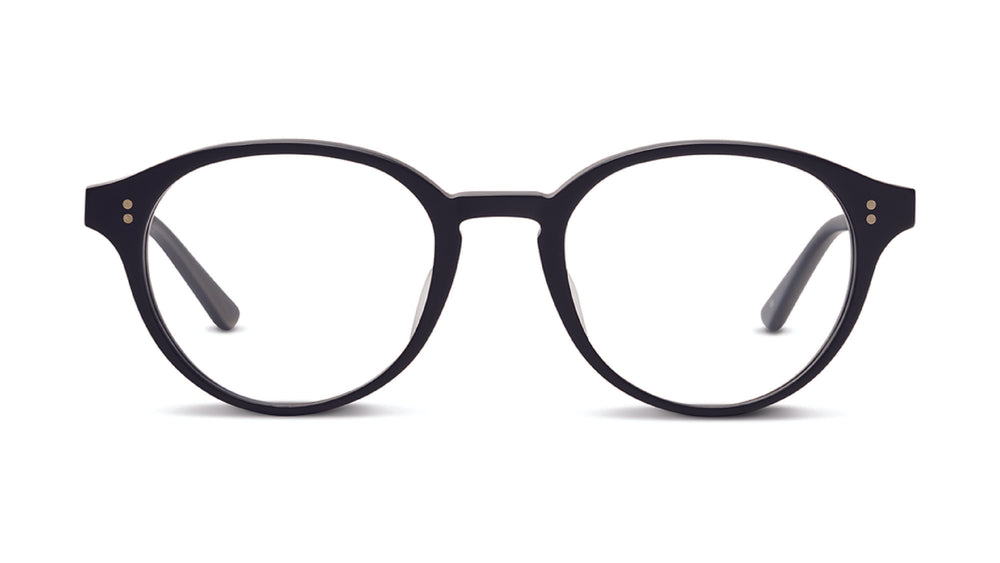 These are sophisticated round-framed glasses with a classic silhouette. The frame features a clean, minimalist design in matte black with subtle rivets on the front corners. The rounded shape has a slightly retro aesthetic while maintaining a contemporary feel. The saddle bridge and medium-thickness frame provide a balanced, comfortable look suitable for everyday wear. The temples smoothly integrate with the front frame, creating a cohesive design that would complement many face shapes.