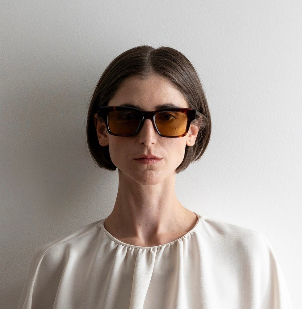 Classic square-shaped sunglasses featuring a luxurious tortoiseshell acetate frame in rich brown and amber tones. The chunky, bold frame design is complemented by warm yellow-tinted lenses, creating a sophisticated vintage-inspired aesthetic. The substantial temple arms match the front frames tortoiseshell pattern, while maintaining clean geometric lines. These sunglasses offer a timeless silhouette with premium construction and attention to detail in the LAPIMA JOAQUIM design.