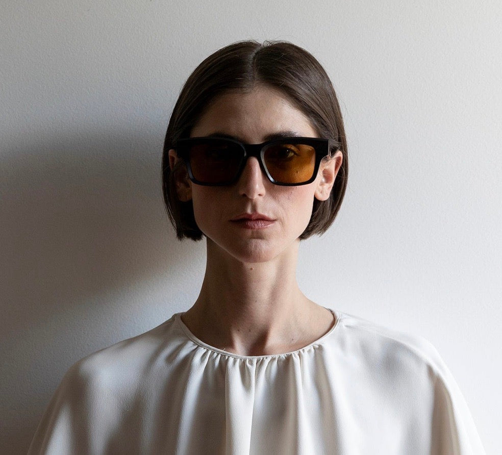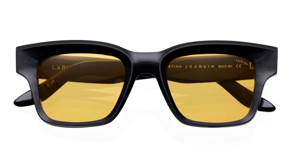 The JOAQUIM by LAPIMA features a bold, contemporary square frame design with thick black acetate construction. The yellow-tinted lenses create a striking contrast against the dark frame while providing enhanced visibility. The sunglasses showcase a clean architectural aesthetic with straight lines and geometric angles. The substantial temple arms and integrated saddle bridge create a solid, well-balanced look thats both modern and timeless.